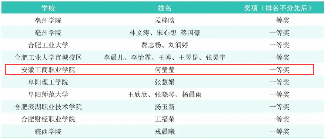 本次大赛获奖不仅是学生个人专业能力与综合素质的体现,更是我院在培养应用型、创新型人才方面成果的生动展现。学院将以此次赛事为契机,搭建更多实践平台,鼓励学生将专业知识与社会需求相结合,在服务地方发展中锤炼本领、绽放青春,为现代化美好安徽建设贡献更多青春力量。(撰稿:赵昆 一审:赵昆 二审:汪锋 三审:曹大友)