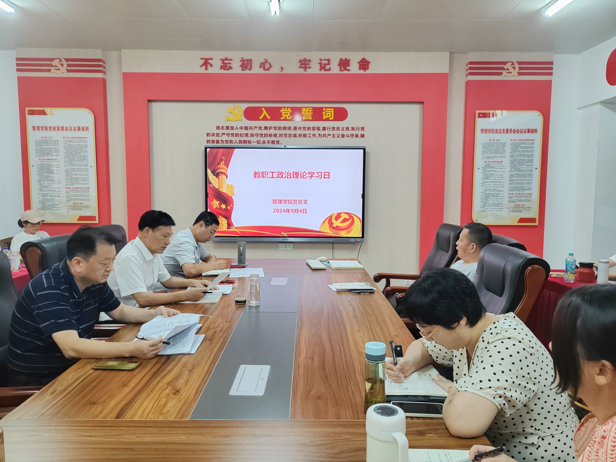 9月4日下午,管理学院在学院党员活动室召开新学期教职工政治理论学习会。会议集中学习《中共中央关于进一步全面深化改革、推进中国式现代化的决定》、习近平总书记在中央全面深化改革委员会第六次会议上的讲话精神,深入学习《中共中央 国务院关于弘扬教育家精神加强新时代高素质专业化教师队伍建设的意见》(以下简称《意见》),学习研讨校党委书记齐建平同志在新学期全体教职工大会暨四届三次教代会、工代会上所作的《学院工作报告》。学院党总支书记曹大友主持学习会,学院领导班子成员及全体教师参加学习。