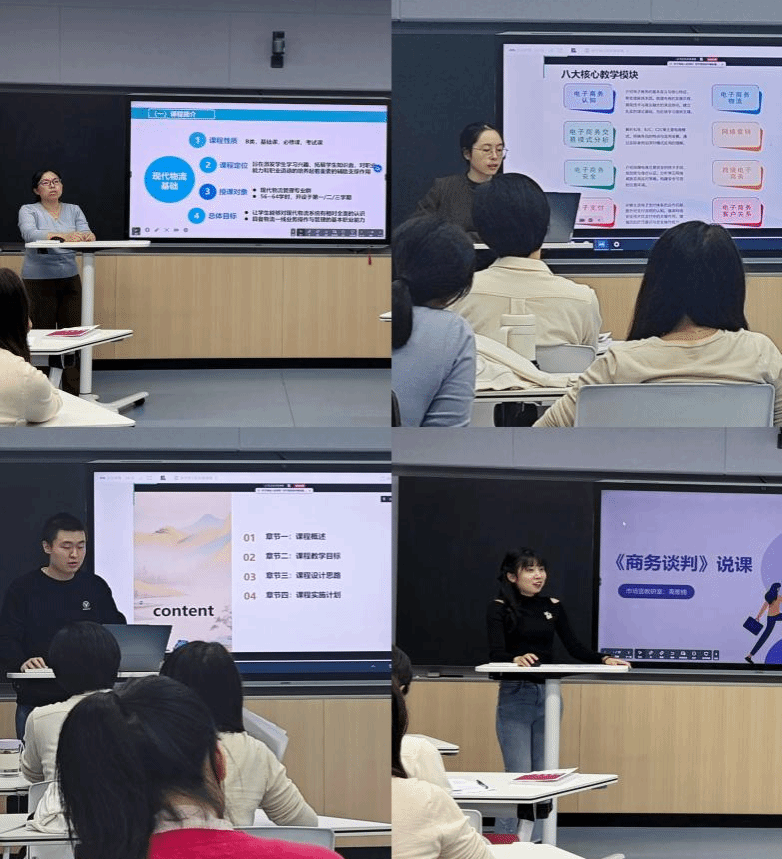 在随后的说课环节,四位教师分别以《电子商务基础》《内容策划与编辑》《现代物流基础》《商务谈判》等专业课程为例,围绕课程定位、教学内容、教学方法与手段、课程评价等方面展开生动讲解。教师们紧密结合行业发展趋势与学生学情,灵活运用案例教学、项目驱动、实战演练等多元化教学模式,充分体现了“以学生为中心”的教学理念,落实了应用型人才培养的目标。