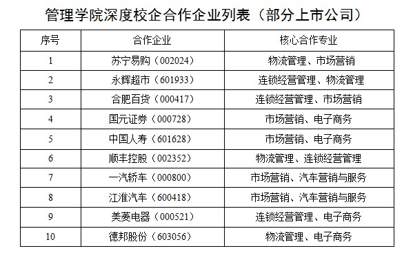 管理学院集中了现代优势商科专业,现有全日制在校生2000余人。始终坚持“立足合肥、面向安徽,以市场需求为导向、以能力培养为根本”的办学方向,大力推进校企合作育人,创新人才培养模式,改进教育教学方法,注重质量,突出特色,依托专业群建设优势,以培养综合素质高,实践能力强,发展后劲大的应用型、复合型经营管理人才为目标,为社会培养了一大批优秀中高级经营管理人才,很多校友已成为我省商贸行业领军人物。