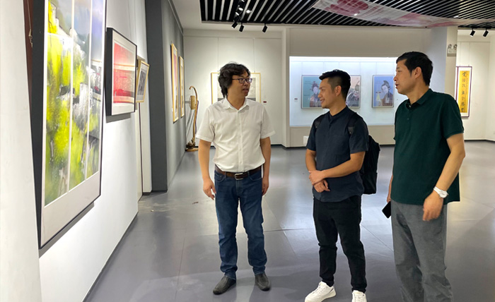 讲座结束后,孔成院长代表学院对郑龙伟老师的精彩讲座表示感谢,并带领其参观了艺术设计学院特色工作室、大师工作室、合瓦·VISION艺术馆观。在展馆观看了我校庆祝中国共产党成立100周年师生书画摄影与设计作品大展。