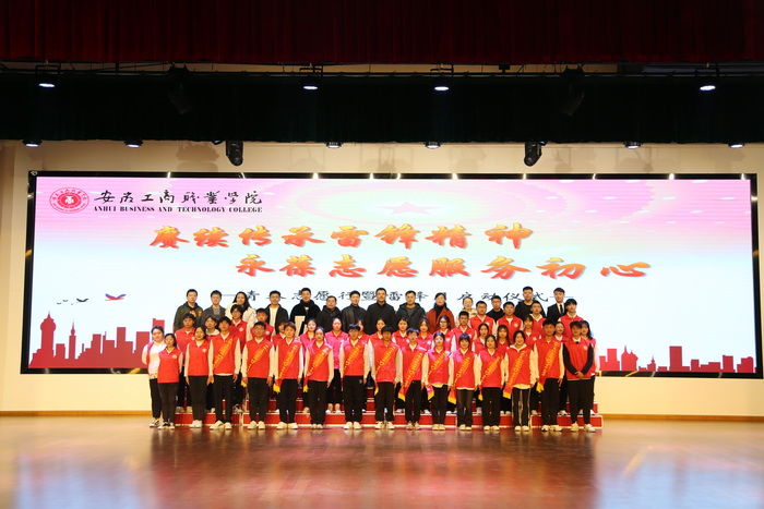 各二级学院党总支书记为志愿者代表授予绶带。陈行为“学雷锋”志愿服务队授旗。校青年志愿者协会会长郭宇鹏代表全体志愿者向全校师生发出“向雷锋同志学习,积极参与志愿服务活动,在互助与奉献中锻炼自我,在友爱和进步中构建和谐,用青春激情传递爱与希望,让雷锋精神历久弥新,让爱国主义成为校园主旋律最强音!让雷锋精神在安工商的传承永不停歇!”的倡议。帅逸凡同学带领志愿者代表进行志愿宣誓仪式。全体人员与安之声合唱团一起合唱《学习雷锋好榜样》,共同缅怀革命先烈雷锋,唱响雷锋精神。