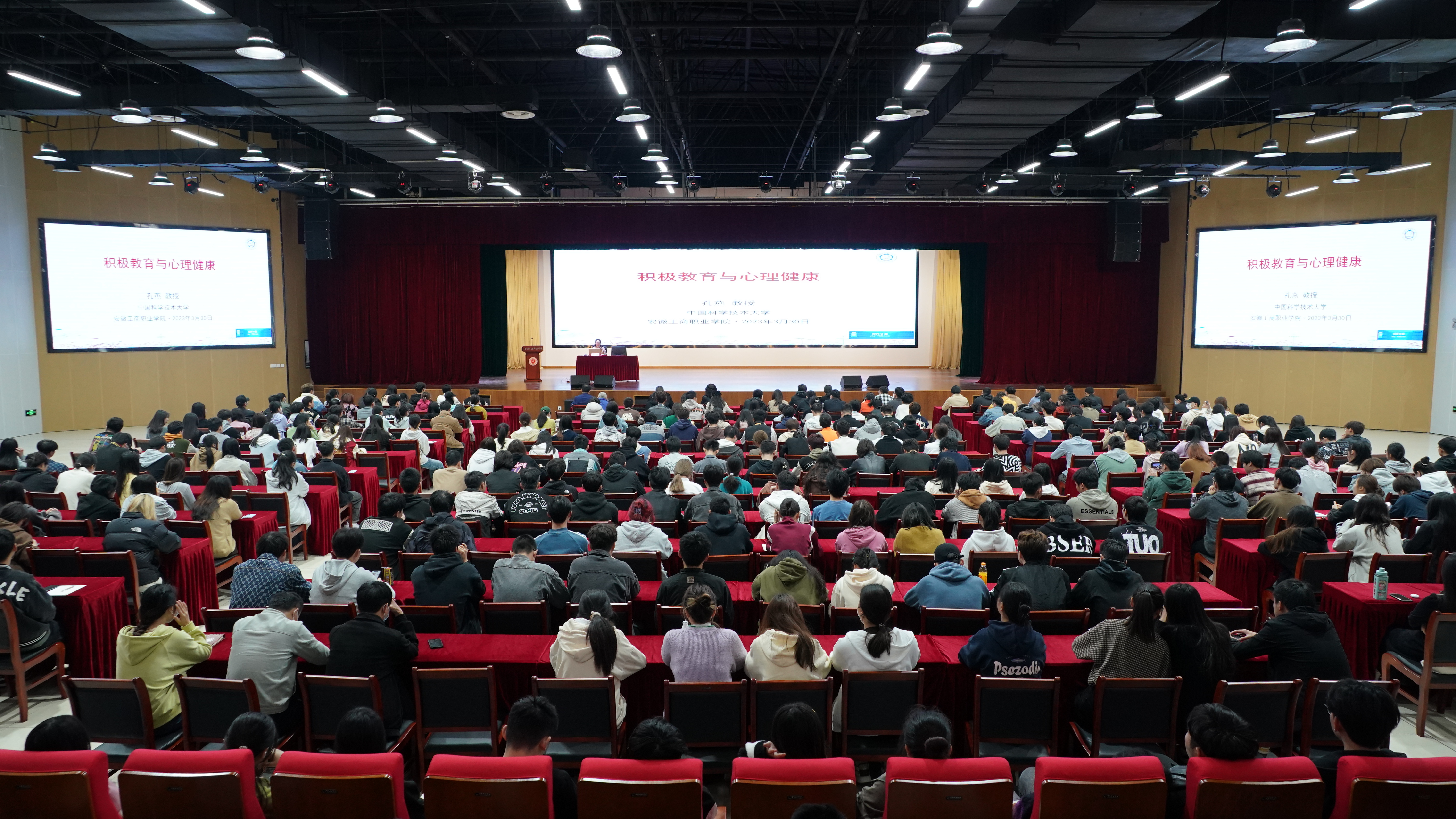 3月30日上午,中国科学技术大学二级教授、博士生导师孔燕莅临我校,在大学生活动中心为我校师生作了“积极教育与心理健康”的专题讲座。讲座由党委委员、副院长胡捍东主持,相关职能部门负责人、部分二级学院书记、辅导员以及班级心理委员、寝室长等学生代表600余人聆听了讲座。