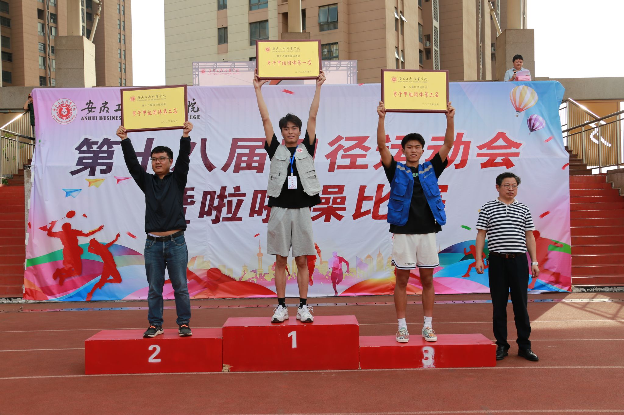 师生拼搏迎盛会,竞技场上竞风流。5月19日下午,阳光明媚、清风和煦,历时三天的全校第十八届田径运动会暨啦啦操比赛顺利完成全部预定赛项,圆满落幕。校领导齐建平、陈行、胡捍东和吴松飞出席闭幕式,并分别为获得各团体奖项的代表队颁奖。