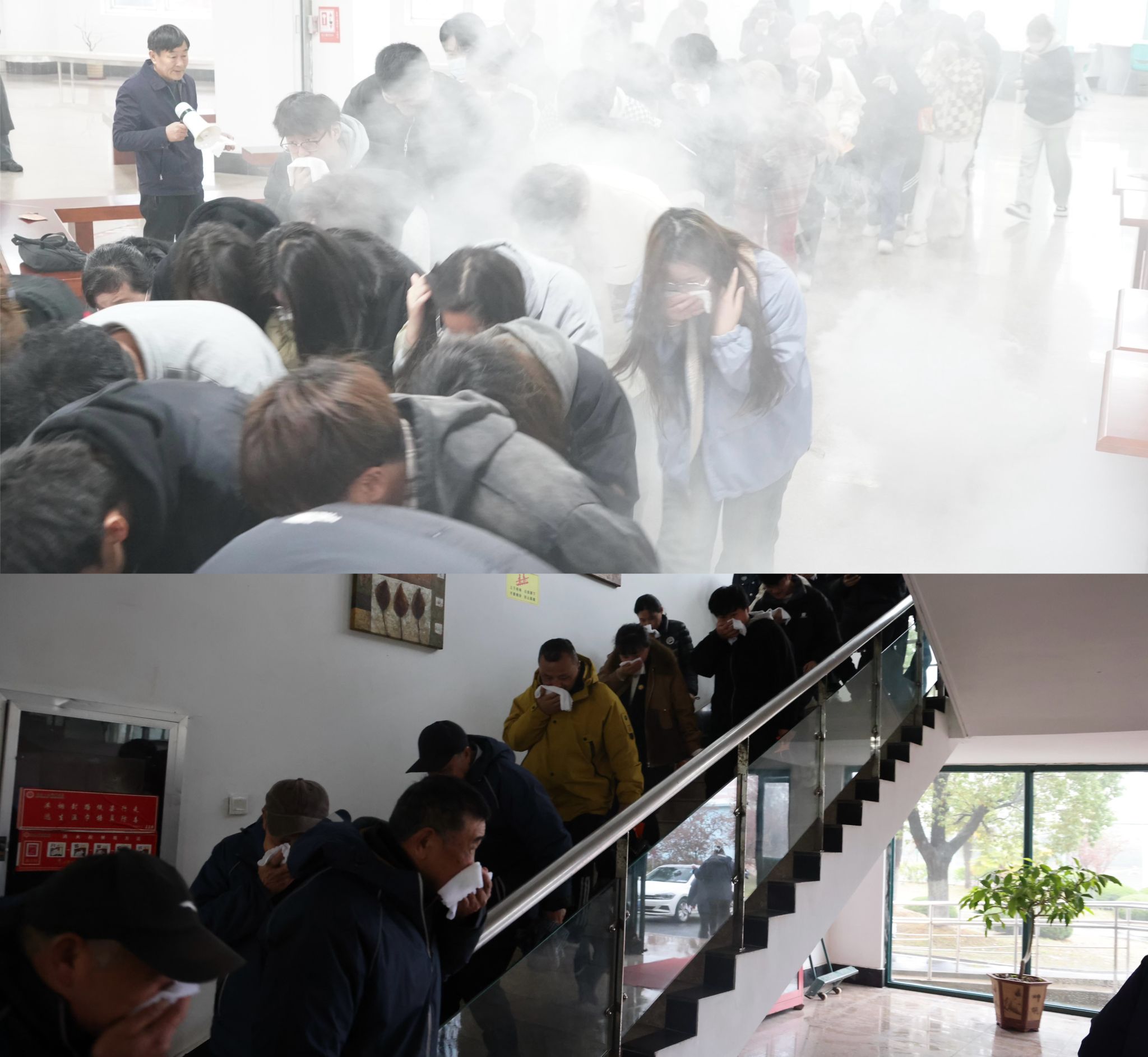 讲座结束后,以图书馆二楼为模拟火灾地点,随着警报声响起,现场浓烟滚滚,面对“突发的火情”,大家按照指示用湿毛巾捂住口鼻,压低身体迅速从消防通道撤离,抵达室外安全区域。撤离过程中,师生反应敏捷、行动迅速规范、撤离井然有序。消防疏散逃生应急演练结束后,大家迅速动员起来,手执灭火器,进行灭火操作体验。