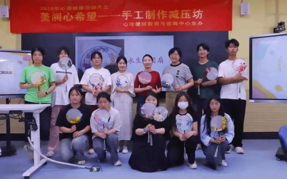 心理健康月特色活动之“手工制作减压坊”活动更是巧妙地将积极心理与美育、劳育融合,在制作团扇的过程中,学生们不仅感受到中华优秀传统文化的魅力,也体验了专注带来的平和、愉悦心境。通过实践体验与心理疗愈等多种途径,有效增强心理韧性,滋润放松心灵。