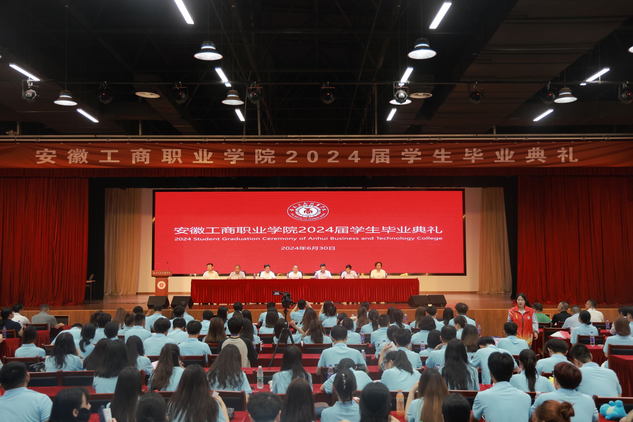 仲夏花开,骊歌声起。6月30日上午,我校2024届学生毕业典礼大学生活动中心顺利举行。校党政领导班子齐建平、陈行、胡捍东、吴松飞、刘浩、孔成、朱小龙出席典礼,相关职能部门负责人、教师代表、宿管员代表、安保人员代表、餐饮工作人员代表、毕业班辅导员及2024届毕业生参加典礼。典礼由党委副书记陈行主持。毕业典礼在庄严的国歌声中拉开序幕。