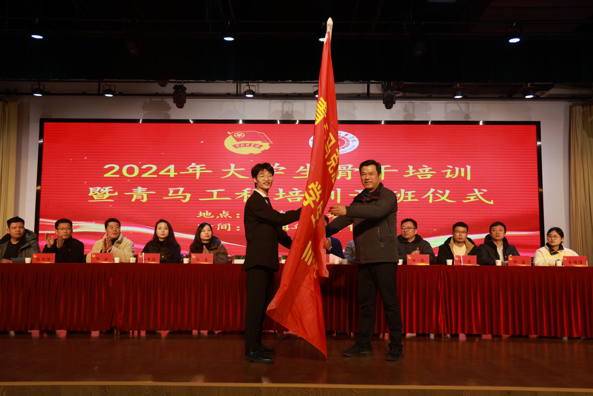 12月17日中午,我校“青马工程”培训班在大学生活动中心正式开班。校党委副书记陈行出席,各二级学院团总支书记、校团委老师,24级各班班长、团支部书记,各级学生会组织主要学生干部、校级社团负责人参加。陈行为学员代表孙业泉授旗。校学生会执行主席韩佳辉作为学员代表发言;校广播站站长王若楠带领全体学员宣誓。“青马工程”全体学员满怀热忱、齐聚一堂,共同迎接这场意义非凡的思想盛宴。
