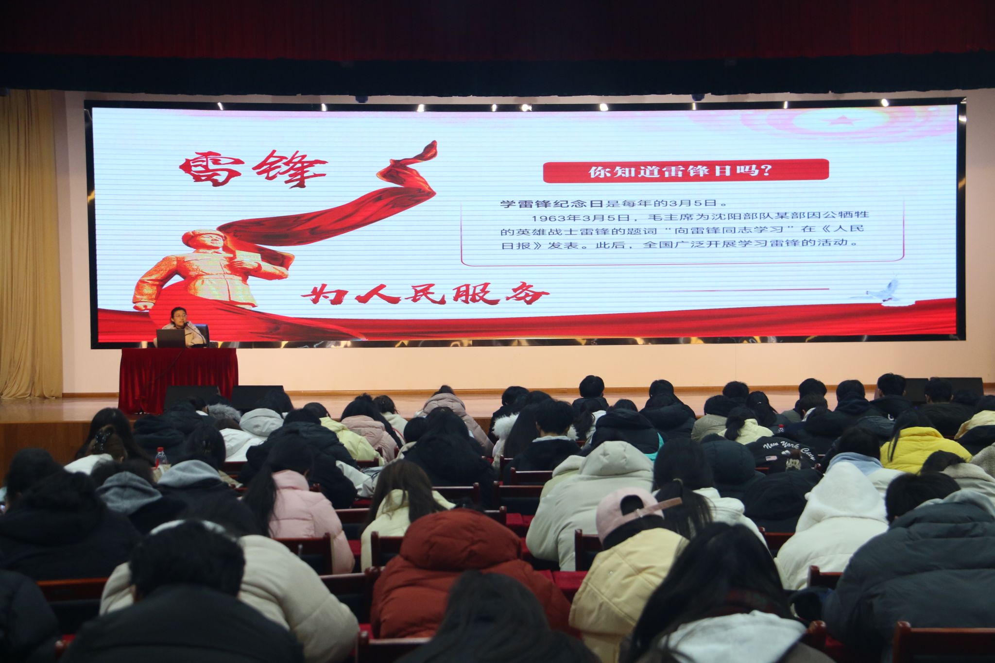 为贯彻落实习近平总书记关于开展学校思想政治理论课教育的重要指示精神,把学校思政课作为落实立德树人根本任务的关键课程,大力培育、弘扬和践行新时代雷锋精神。3月5日中午,校团委特邀两位马克思主义学院教师在大学生活动中心为学生上了一堂别开生面的“学雷锋”主题思政课,全校各二级学院学生代表、青年志愿者骨干等300余人参加活动。