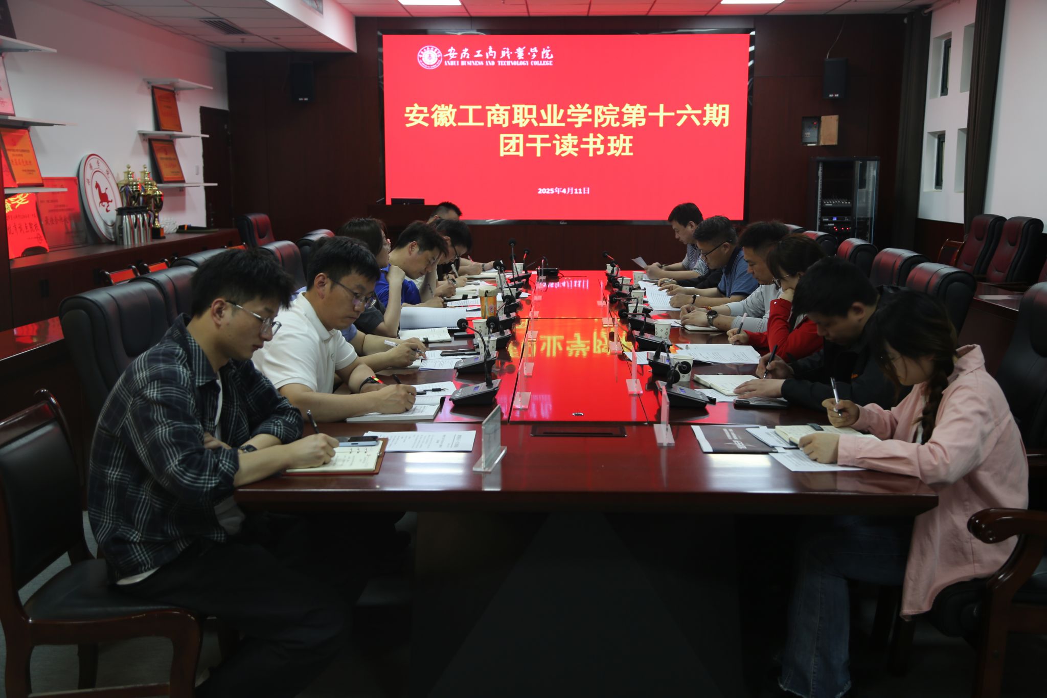4月12日中午,安徽工商职业学院第十六期团干读书班在旅游健康学院顺利举行。旅游健康学院党总支书记杨锐、副书记刘燕以及各二级学院团学工作负责人参加读书班学习,活动由校团委副书记童乐主持。