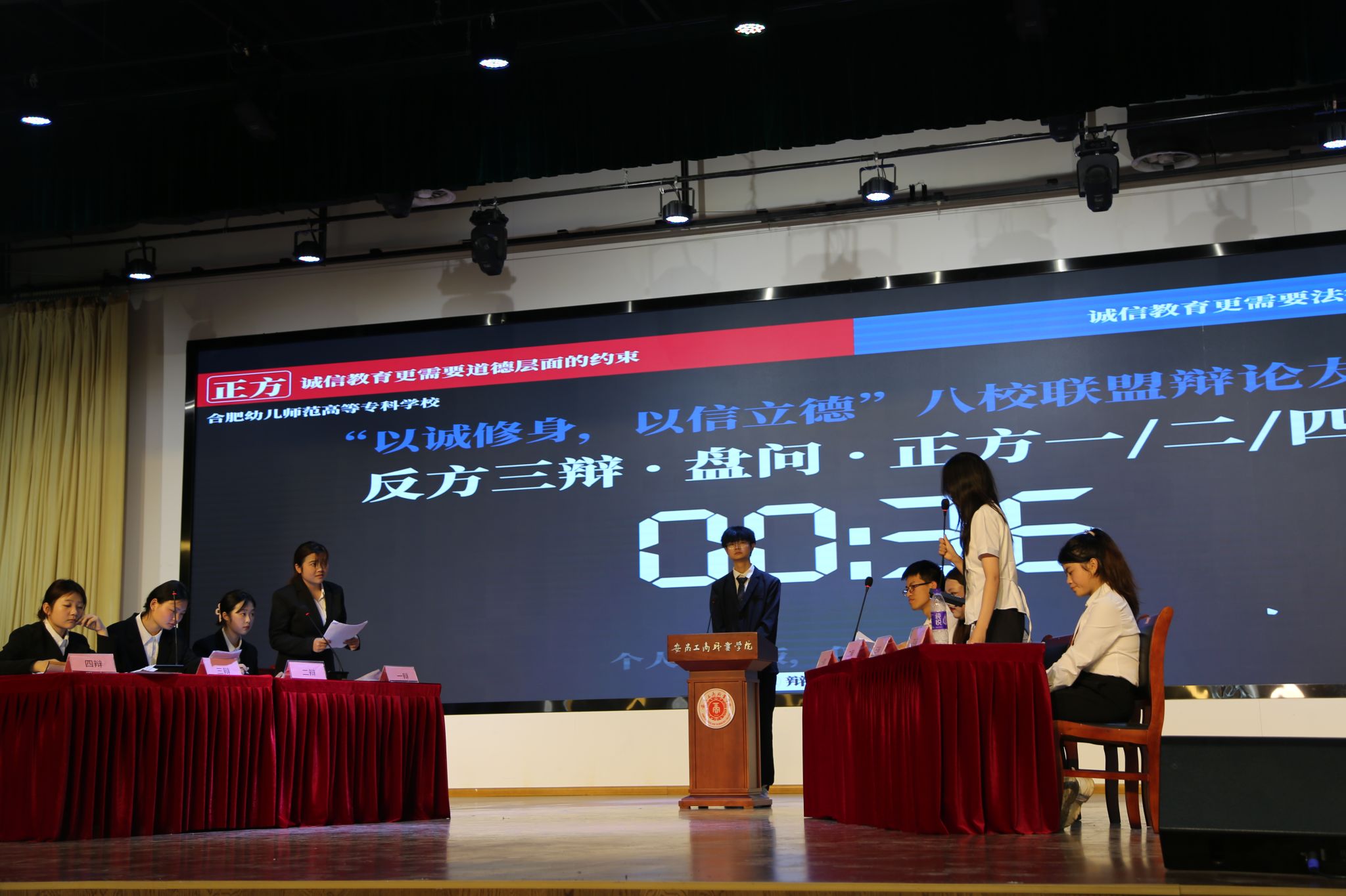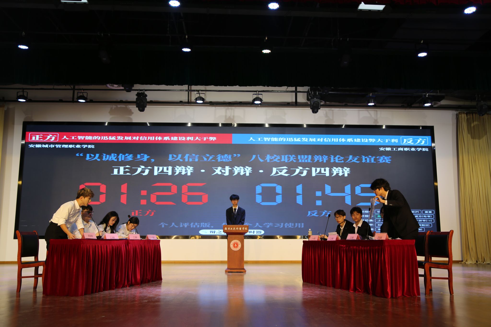 思辨交锋:唇枪舌剑话诚信。上午的八校联盟启动仪式结束后,安徽职业技术学院辩论队、安徽警官职业学院辩论队、安徽财贸职业学院辩论队、安徽城市管理职业学院辩论队、安徽审计职业学院辩论队、合肥幼儿师范高等专科学校辩论队、安徽广播影视职业技术学院辩论队以及安徽工商职业学院辩论队齐聚一堂,以语言为刃、以逻辑为盾,共话诚信之道,共绘青春友谊。活动全程贯穿“友谊第一,比赛第二”的理念,围绕诚信教育主题设置多元辩题,涵盖“诚信教育更需要道德层面的约束/法律层面的保障”、“教育评价体系应该更加重视学生的诚信记录/学术成绩”、“deepseek等语言类模型的爆火,随之出现AI造假论文等现象。由此可见,人工智能的迅猛发展对信用体系建设利大于弊/弊大于利”、“当代大学生的诚信理念树立,学校教育/社会实践更重要”等四组现实议题。全天八支队伍分四组展开对决,辩手们引经据典、妙语连珠,既有对社会热点的犀利剖析,也不乏对传统文化价值的深刻诠释。“这不仅是一场辩论赛,更是一次价值观的共鸣之旅。”校辩论协会会长周楷翔感慨道,“我们在交锋中看见差异,也在共识中收获成长。”