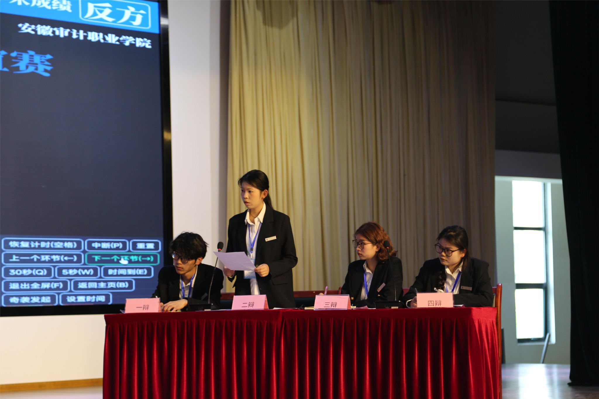 八校联盟启动仪式:活力与仪式感交织。上午10时,活动在热烈的氛围中拉开帷幕。校健美操协会以一曲扇子舞《寄明月》点燃全场,传统韵味与现代活力完美融合,赢得阵阵掌声。随后,现场播放的短片《八校同心·辩途同行》生动呈现了各参赛队伍备赛历程与团队风采,传递出“以辩会友”的温暖力量。童乐致辞表示:“诚信是立身之本,辩论是求真之途。希望青年学子在观点交锋中锤炼思辨能力,在思想碰撞中筑牢诚信之基。”安徽审计职业学院辩论队领队张天露作辩友代表发言,他强调“胜负之外,更珍视跨校交流的收获与情谊”。随着八校代表共同上台合影留念,标志着校际辩论合作网络正式建立。