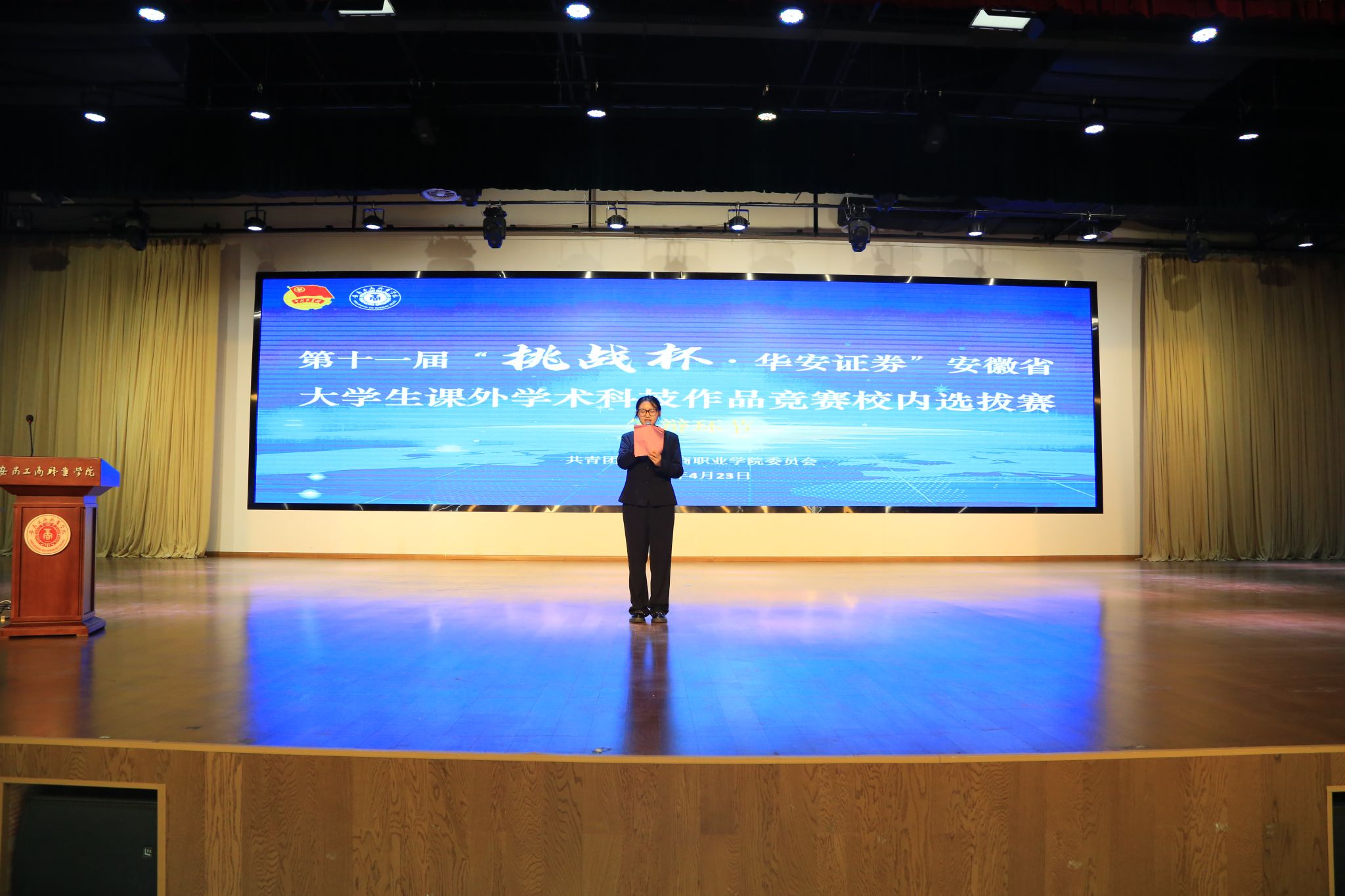 4月23日下午,第十一届“挑战杯·华安证券”安徽省大学生课外学术作品竞赛校内选拔赛在大学生活动中心举办。比赛邀请了合肥工业大学副研究员凌训延、合肥宏立电子有限公司总经理王冰波、安徽晓阳科技有限公司副总经理毛金友等专家担任评委,校团委委员、各二级学院团总支书记、参赛指导教师、学生等共计300余人到现场进行了观摩。