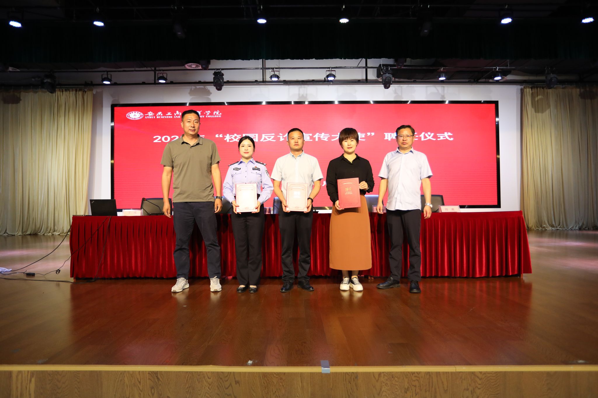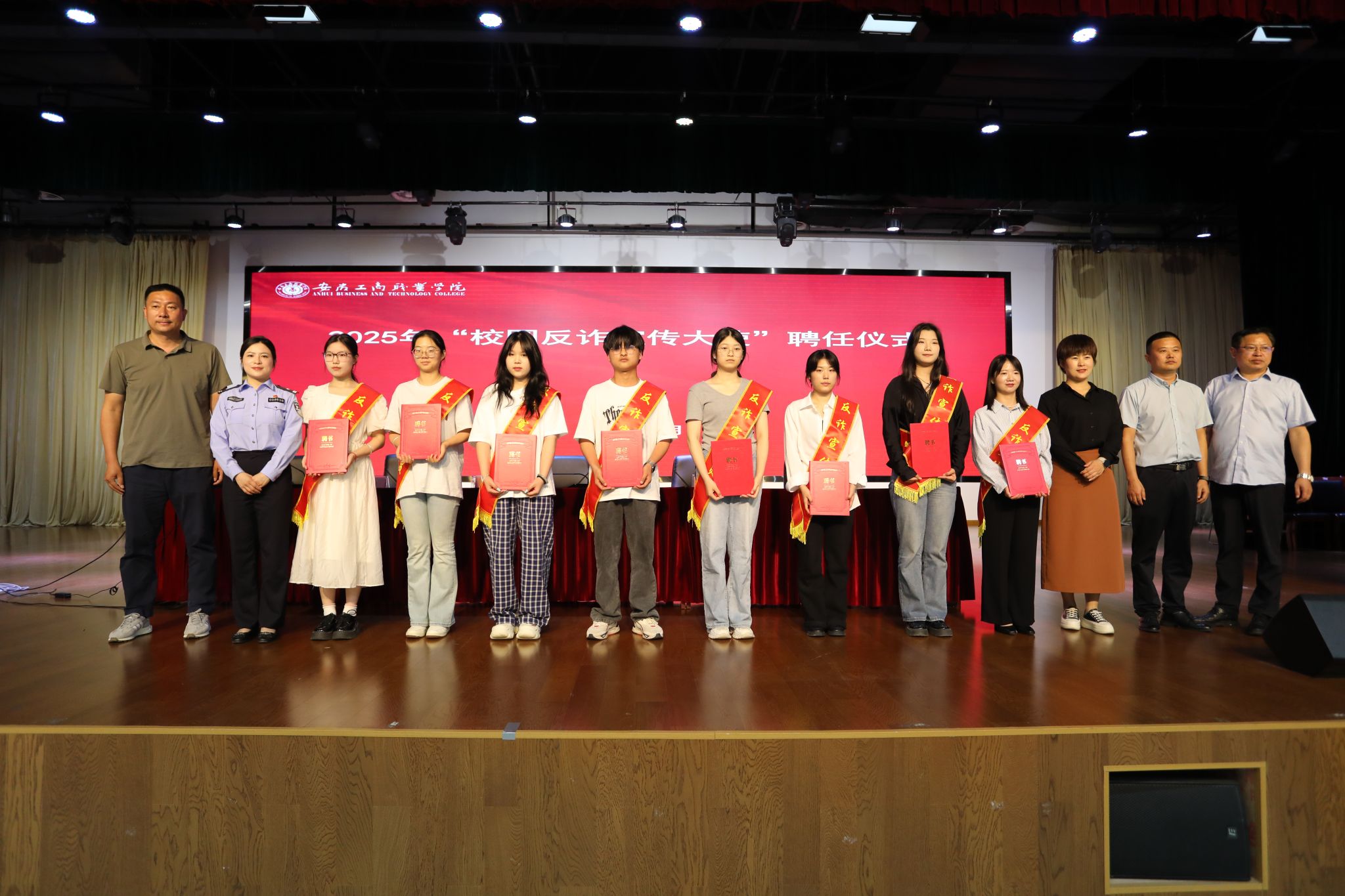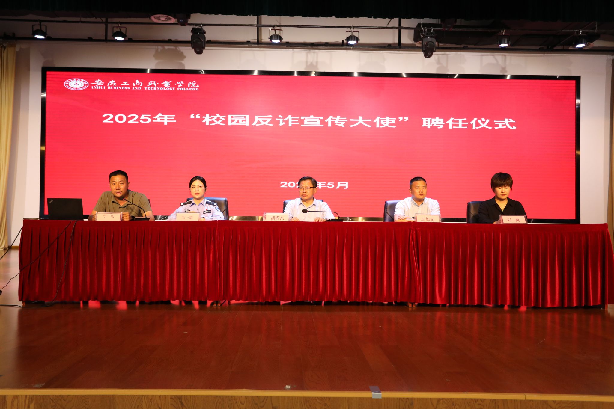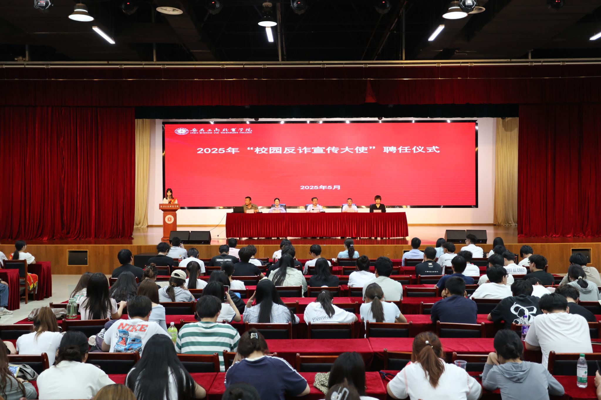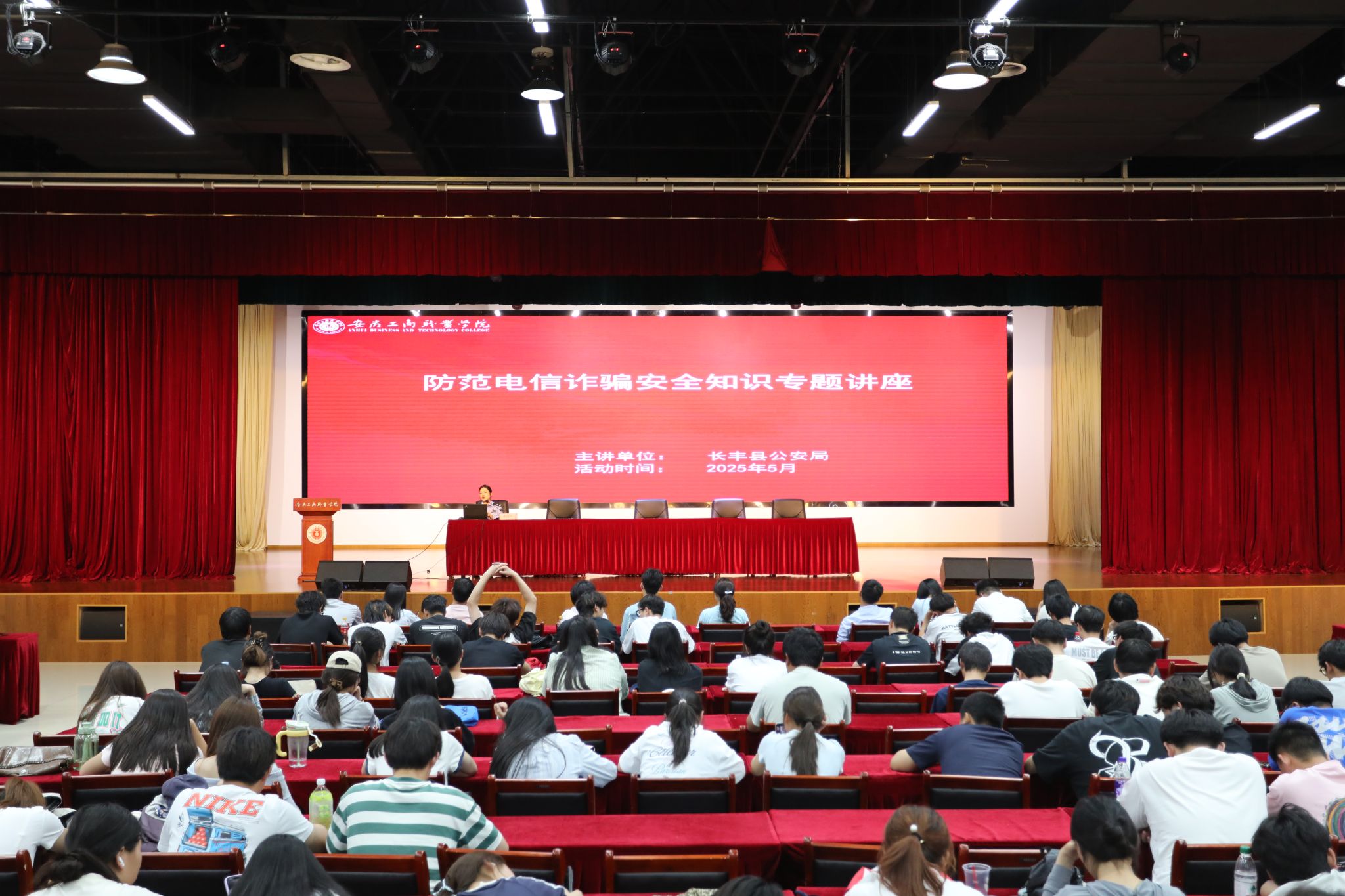 为深化校地协同治理,扎实推进“无诈校园”建设,5月29日,我校在双凤校区大学生活动中心举办了反诈宣传大使聘任仪式暨防范电信网络诈骗专题讲座,校党委委员、副院长胡捍东及长丰县公安局、双凤经开区综治中心、峰宁社区有关负责同志出席活动,各二级学院党总支书记、辅导员及800余名学生代表参加活动。本次活动由安全管理处副处长丁闯主持。