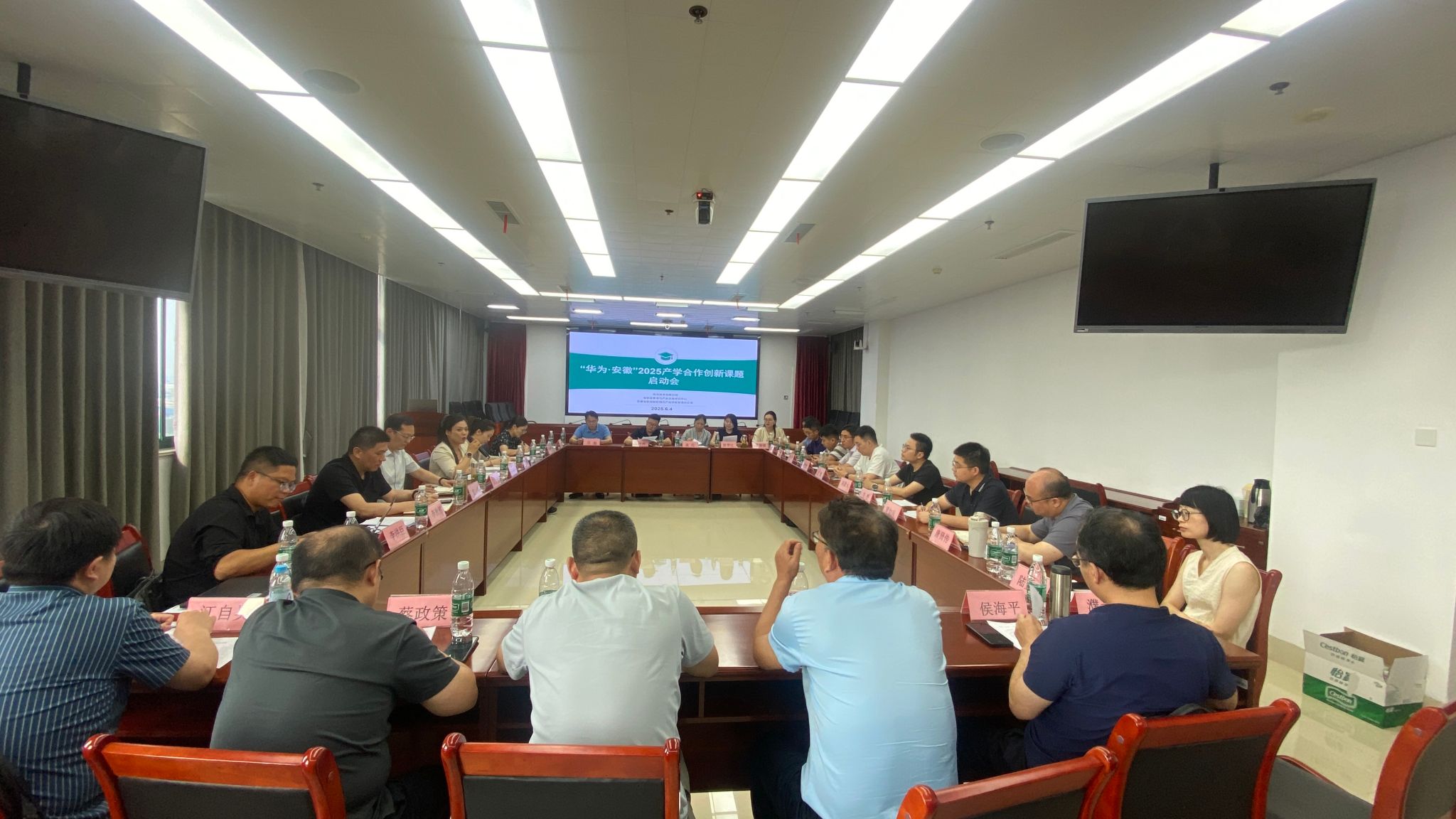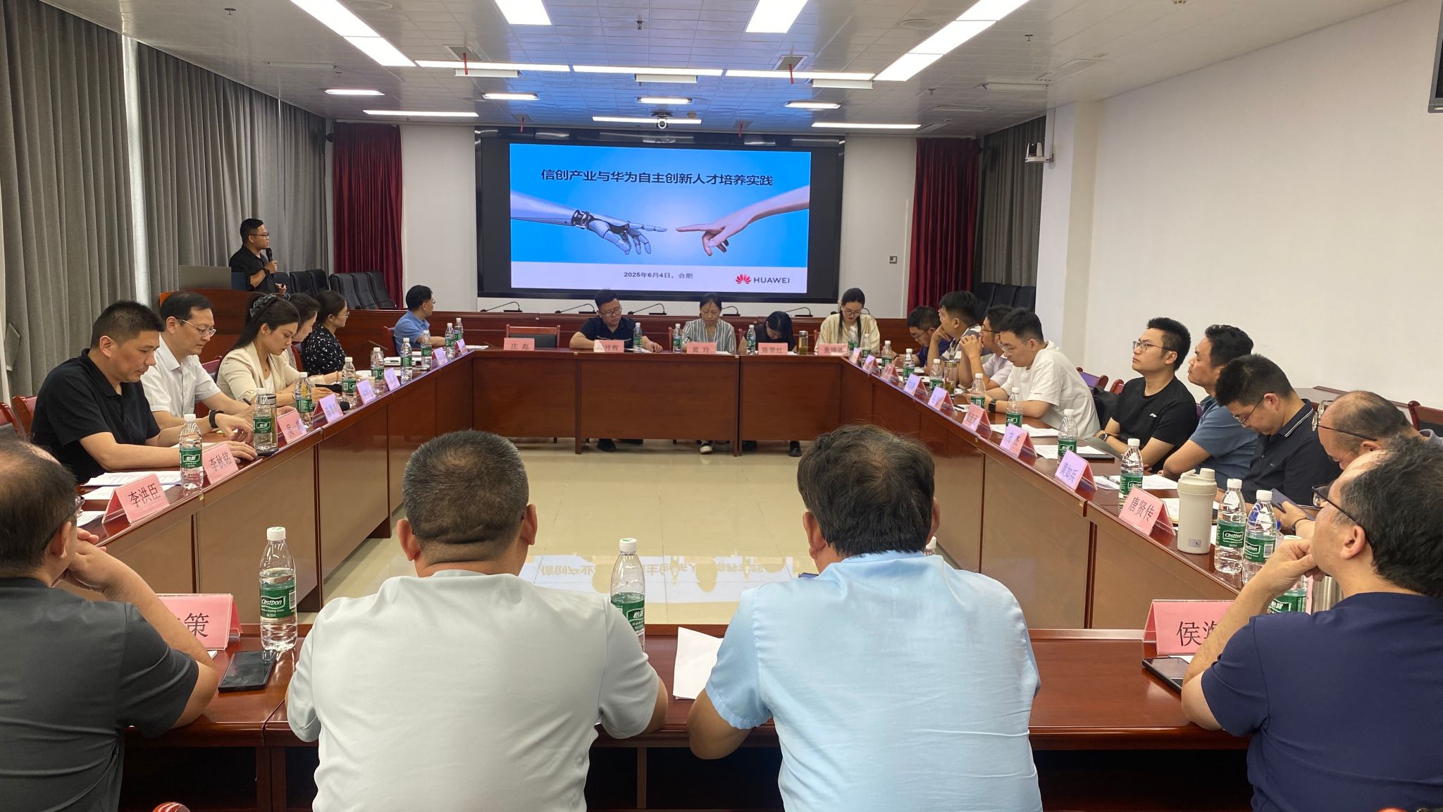 6月4日下午,“华为·安徽”2025产学合作创新课题启动会在我校召开。安徽工商职业学院党委委员、副院长陈章奇,安徽省教育厅高教处一级主任科员任雯君,安徽省职业教育与产业发展研究中心秘书长、安庆职业技术学院科技处处长吴一鸣,安徽工商职业学院信息工程学院院长范生万,教育厅挂设机构办公室主任张娴,华为安徽政企教育行业代表李秋铭,华为安徽政企教育解决方案专家李洪臣,华为产教融合业务经理袁铭健,以及来自安徽职业技术学院、芜湖职业技术学院等9家高职院校的11位华为创新课题负责人和部分团队成员参加会议。会议由副院长陈章奇主持。