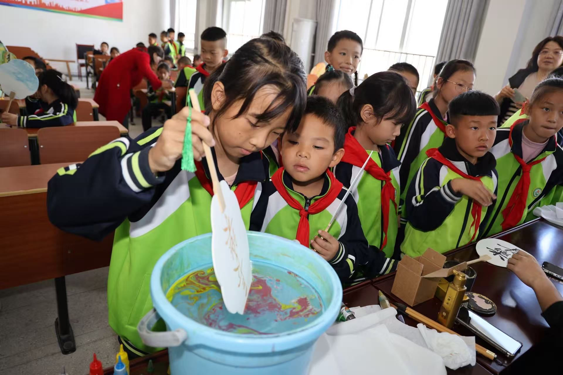 调漆、点色、入水、搅动、沉浮、提转……每一个步骤都充满了新奇与挑战。志愿者们半蹲在孩子们身边,大手握着小手,一同在清水中拨动色彩的涟漪,见证素白的扇面在水中与各色大漆相遇、相融,幻化出独一无二的绚丽纹样。当孩子们小心翼翼地将属于自己的那把独一无二的漆扇从水中提起时,现场响起阵阵惊喜的欢呼。一把把色彩斑斓、纹样各异的漆扇,不仅是非遗技艺的结晶,更是大手与小手共同创造的艺术成果,凝聚着陪伴与成长的温暖。