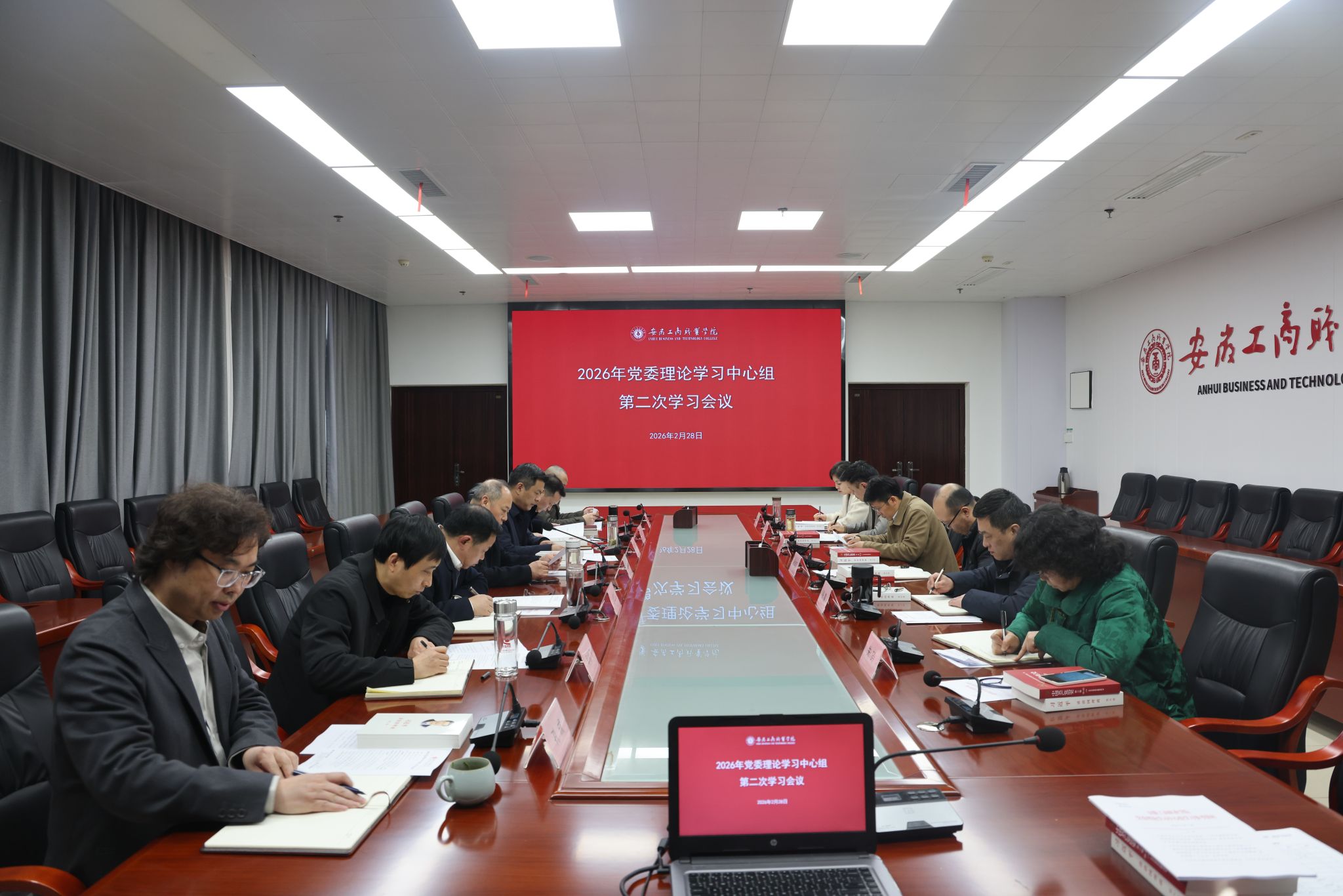 2月28日下午,校党委召开2026年第二次理论学习中心组学习会议,集体学习了习近平总书记在中共中央政治局第二十四次集体学习时、省部级主要领导干部学习贯彻党的二十届四中全会精神专题研讨班开班式上、2026年春节团拜会上的重要讲话精神,学习了中办《关于在全党开展树立和践行正确政绩观学习教育的通知》精神,学习了省两会精神。党委书记齐建平主持学习并讲话。校党委班子成员参加会议,相关院部处室主要负责人列席会议。