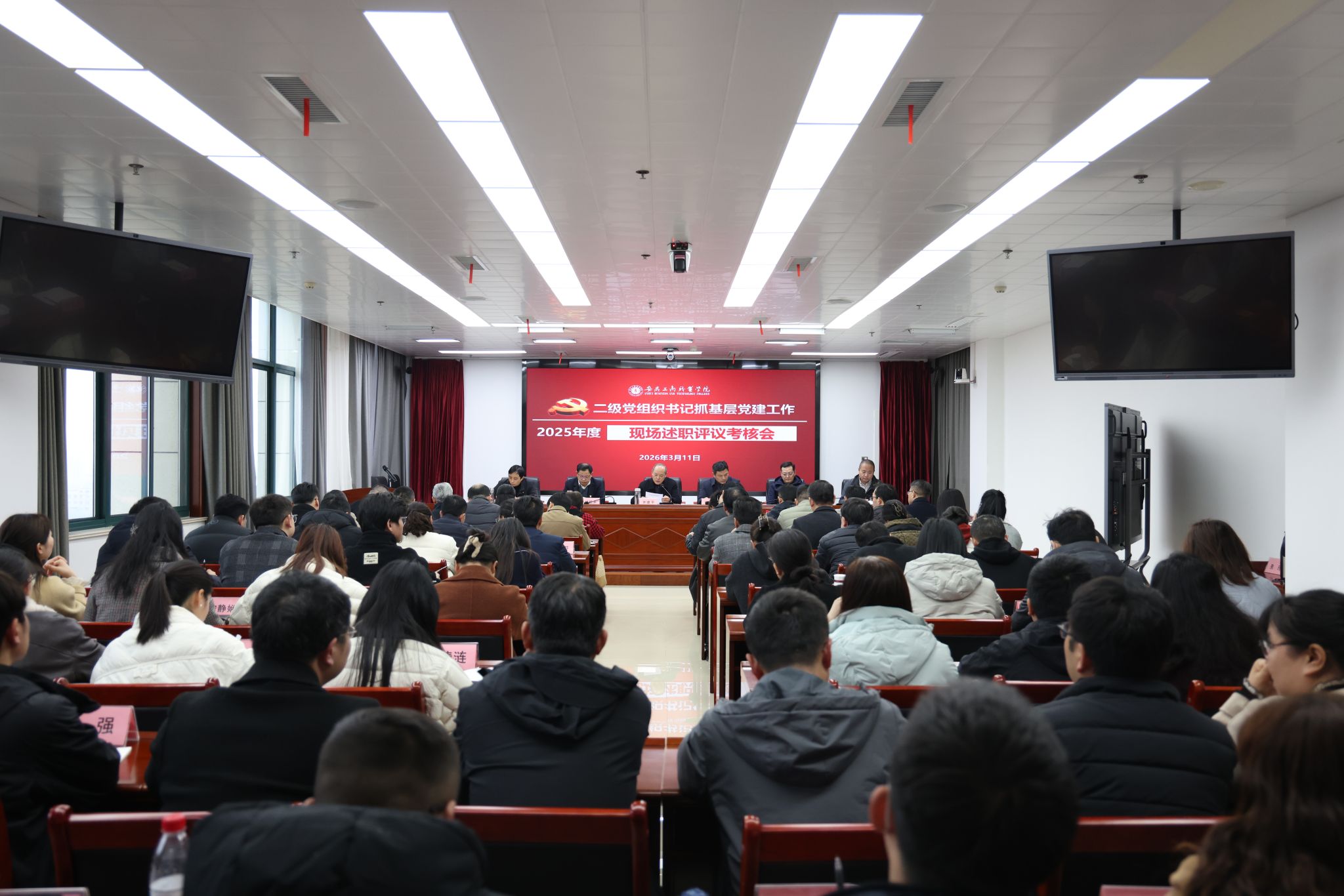 3月11日下午,学校召开2025年度基层党组织书记抓基层党建工作述职评议会议,党委班子成员出席会议,各二级党组织书记、副书记,基层党支部书记,部分职能部门负责人、部分党代表、教代会代表、教师和学生代表参加考核会议。会议由党委书记齐建平主持。