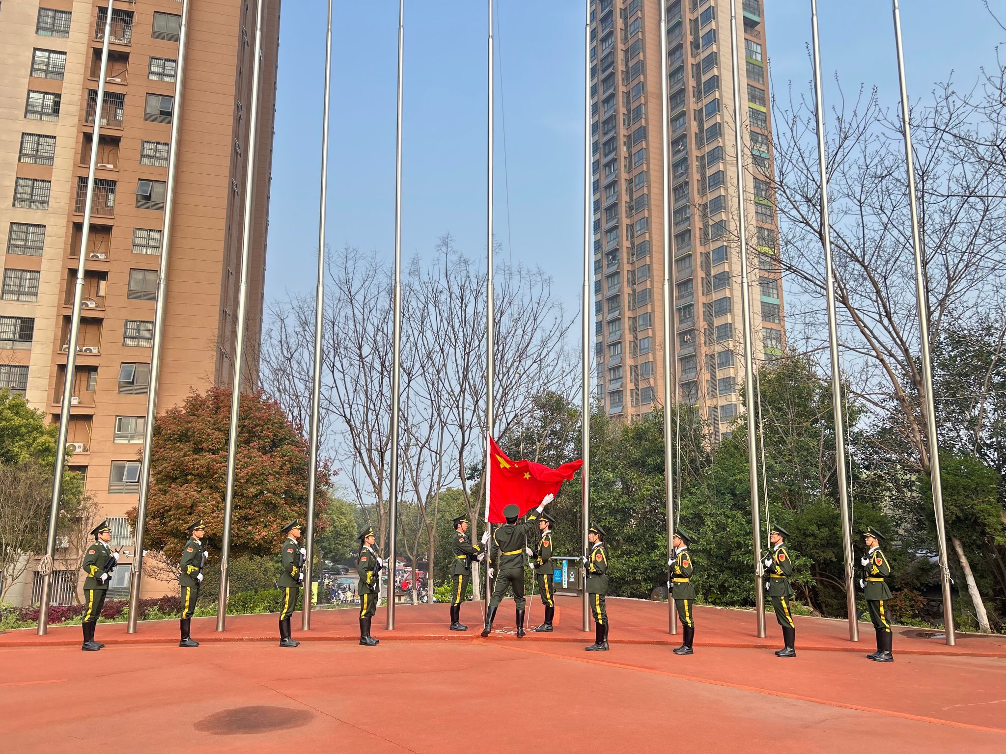 七时二十分,国旗护卫队身着戎装、步伐铿锵,护卫着五星红旗走向升旗台。伴随着雄壮激昂的《义勇军进行曲》,鲜艳的五星红旗迎着朝阳冉冉升起,全体师生肃立注目,齐唱国歌,向国旗致以最崇高的敬意。春日的晨光映照在每一张青春的面庞上,庄严肃穆的氛围在田径场上空久久回荡。