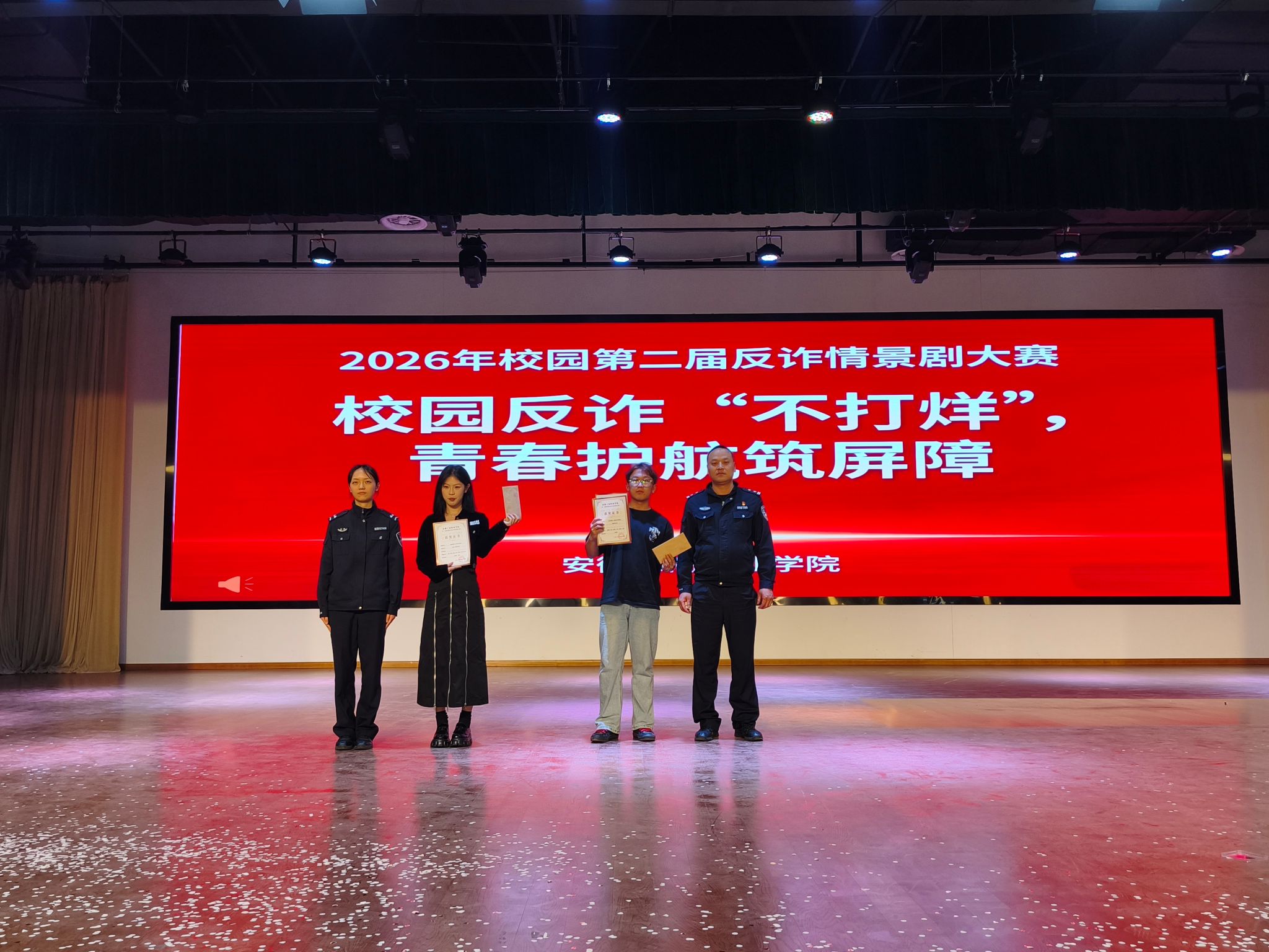 为持续深化校园反诈宣传教育,进一步提升在校生防诈骗意识与识骗能力,筑牢校园安全防线,营造平安和谐的育人环境,4月15日下午,我校第二届“校园反诈‘不打烊’,青春护航筑屏障”情景剧大赛在大学生活动中心隆重举行。校党委委员、副院长胡捍东,校党委委员、党委宣传统战部部长、艺术设计学院党总支书记孔成莅临现场指导。比赛特别邀请长丰县反诈中心张宇警官、双凤派出所李冬警官出席并担任评委,各二级学院书记、副书记到场观摩并参与评审。本次大赛由校安全管理处联合校团委主办,各二级学院积极响应、广泛参与;评委团由各二级学院书记及受邀公安民警共同组成,以确保评审公平、公正、公开。