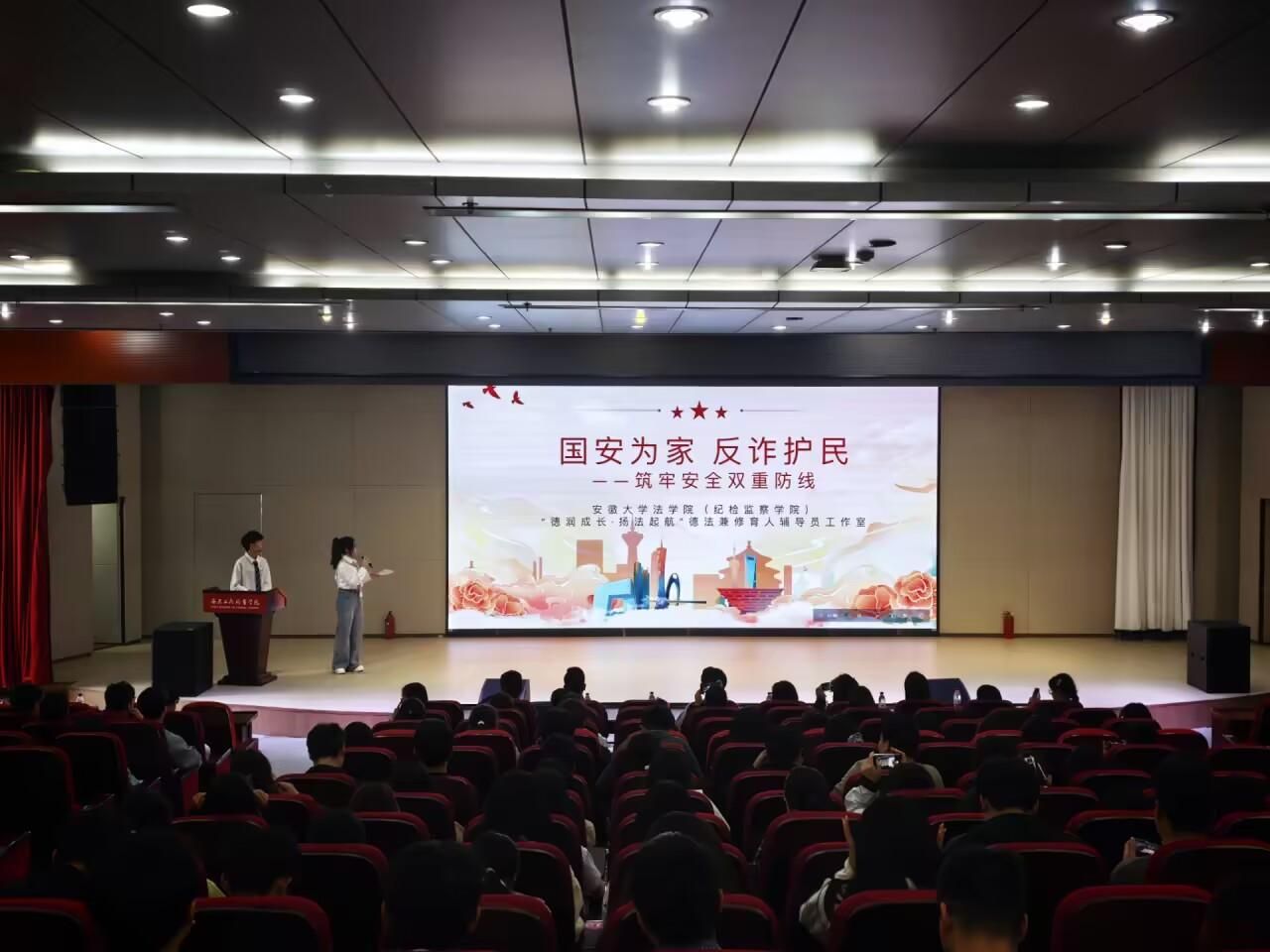 为深入学习贯彻总体国家安全观,在第十一个全民国家安全教育日来临之际,4月15日,安徽大学法学院师生一行来校开展以《国安为家 反诈护民》为主题的国家安全宣讲活动。我校师生代表共300余人参加活动,共同筑牢校园安全与法治思想防线。