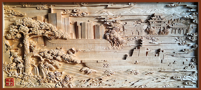 汪德洪用精湛徽州木雕技艺为安徽舰雕刻作品《安徽舰》。作品采用传统手工工艺,雕刻细腻生动,造型别致典雅,文化内涵丰富。画面以安徽舰造型为核心,展示军舰乘风破浪、披荆斩棘走向深蓝。木雕分近景、中景、远景三个层次展示了世界文化遗产地——宏村的徽派古民居、西递的牌坊;现代的合肥地标建筑——安徽广播电视台的大楼;世界文化、自然遗产——黄山迎客松。
