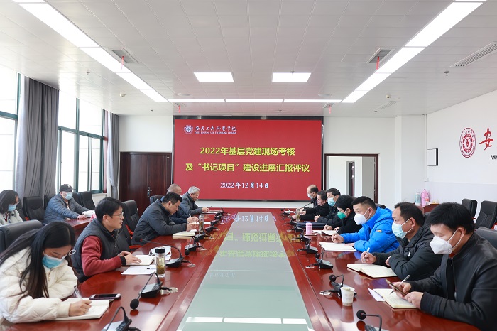 2022年12月14日下午,学校在综合楼三号会议室开展“书记项目”建设进展汇报评议暨2022年基层党建现场考核。校党委副书记陈行,组织人事处、党委宣传统战部负责同志,各二级党组织书记参加现场评议及考核。