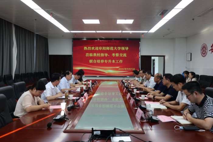 9月5日下午,阜阳师范大学党委常委、副校长汪芳启和党委委员张宏、方强一行来校考察交流专升本联合培养工作。院领导齐建平、李雪、胡捍东、陈章奇在综合楼三号会议室接待了汪校长一行,管理学院、教务处、学生处、本科教学部等部门负责人及相关工作人员参加了会议。