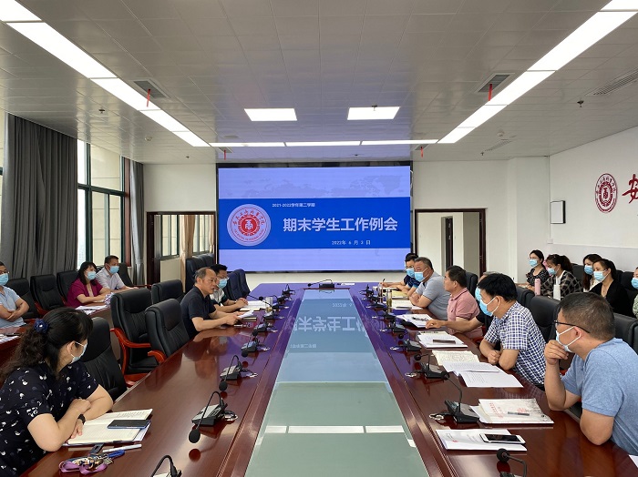 2022 年6月3日,学校在综合楼第三会议室组织召开2021-2022学年第二学期期末学生工作例会。校党委书记齐建平出席会议并讲话。校党委委员、副院长胡捍东主持会议,各二级学院党总支书记、办公室主任,保卫处、财务处、后勤服务中心、团委等处室负责人,学生处(学工部)全体工作人员参加会议。