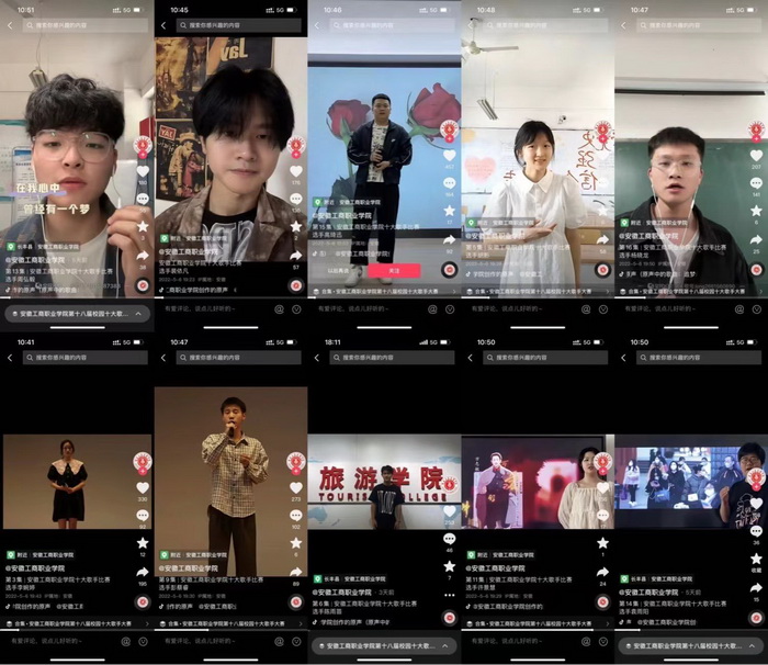 旅游学院 陈雨苗 演唱曲目《华夏》本次校园十大歌手比赛得到了党委宣传统战部及各二级学院团总支的大力支持,各二级学院团总支进行了广泛的线上赛前宣传和精心选拔,共推选了16名最具竞争力和最有潜力的选手参加决赛。歌唱祖国大好河山的《华夏》、婉转动听的《平凡天使》、深情低唱的《椿》、轻快悦耳的《等你下课》等等,每一首歌曲都表达了参赛选手对祖国的热爱、对美好校园的回忆、对未来生活的憧憬,激励广大青年学子在青春的赛道上奋力奔跑,在战疫中绽放青春风采。通过线上安徽工商职业学院官方抖音号网络投票和线下专家评委评分。最终,陈雨苗、李婉婷获得一等奖,彭蔡睿、周弘毅、裴依凡、高琦迅、杨晓龙、胡影获得二等奖,许景惠、袁雨阳、尚恒鑫、王倩、张东昇、毛梓行、陈涛、虞徐炫获得三等奖,大赛前十名将授予“校园十大歌手”荣誉称号。