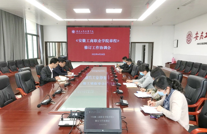 为进一步贯彻落实习近平总书记关于教育的重要论述,贯彻落实新修订的职业教育法,推动依法办学治校,实现高质量发展,4月28日下午,学校在综合楼第三会议室召开《安徽工商职业学院章程》修订工作专班协调会,校党委委员、副院长胡捍东出席会议并讲话,学校章程修订工作专班全体成员参加会议,会议由办公室副主任葛成飞主持。