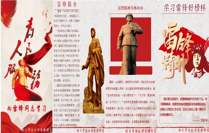 开展“雷锋精神我传颂”活动。3月4日,校青年志愿者协会在艺韵广场发出“学雷锋跟党走 做志愿献青春”的倡议并举行万名学生志愿活动签名。校广播站推出《弘扬雷锋精神 争做时代新人》特别栏目,校大学生社团管理部制作“向雷锋同志学习”的宣传海报,在校园内形成浓厚的学习雷锋精神的氛围,引导全校师生向雷锋同志学习并积极参与到志愿服务活动中来,让雷锋精神在校园里的传承永不停歇。