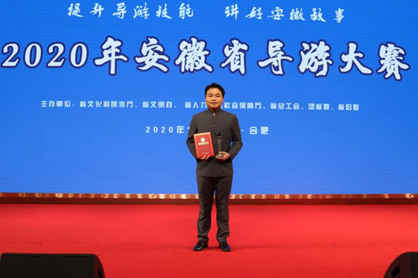 提升导游技能,讲好安徽故事。12月24日,由安徽省文化和旅游厅、省文明办、省人力资源社会保障厅、省总工会、团省委、省妇联共同举办的安徽省导游大赛在合肥闭幕。来自全省16个地市的64名优秀导游在为期四天的比赛时间内同台竞技,一展风采。安徽工商职业学院18级旅游管理(3)班吴康睿同学代表合肥市一路“劈关斩将,杀出重围”,以总分第一名的好成绩获得安徽省导游大赛金奖,这是他继19年全国职业院校技能大赛导游服务赛项一等奖后取得的又一丰硕果实。
