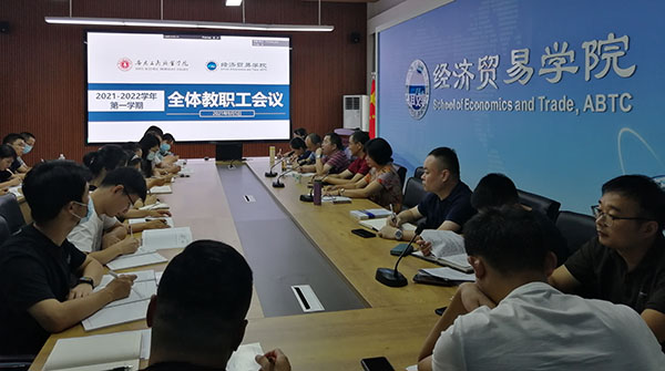 2021年9月5日上午,经济贸易学院在学院会议室召开新学期全体教职工会议,党总支常务副书记沈飞及全体教职工参加会议,校党委委员、副校长汪贤武到会指导,会议由经济贸易学院院长张颖主持。