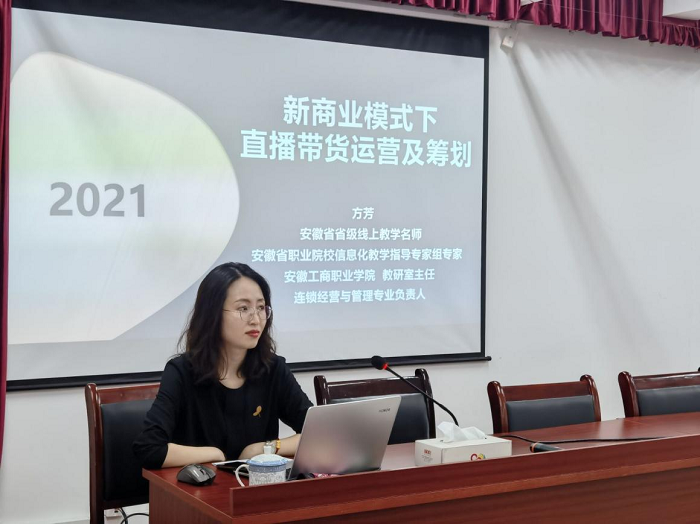 接着由连锁经营与管理专业负责人方芳老师做了《新商业模式下直播带货运营及策划》讲座,从认识直播运营、直播环境创建、组建直播团队、直播流程打造四个方面对专题做了深刻讲解。