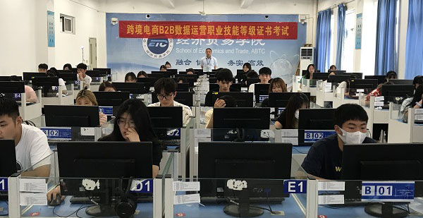6月27日下午,全国“1+X”跨境电商B2B数据运营职业技能等级证书(中级)统一考试在我校实训室505机房进行。本次考试采用机试方式,分为理论考试和实操考试两部分。经济贸易学院院长张颖、教务处副处长姚庆峰到场巡视指导。