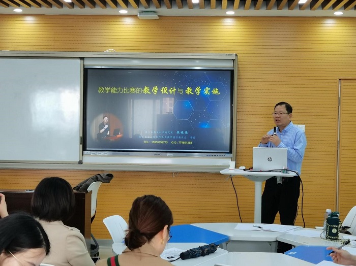 学校邀请了教育部国赛评委、来自厦门教科院的陈振源教授,进行了题为《以赛促教,全面提升教学能力》的专题培训。陈振源教授从评审专家视觉,为教师们在教学能力大赛备赛阶段指明了方向。管理学院朱小龙院长莅临会场给予指导性意见并参与了学习研讨。