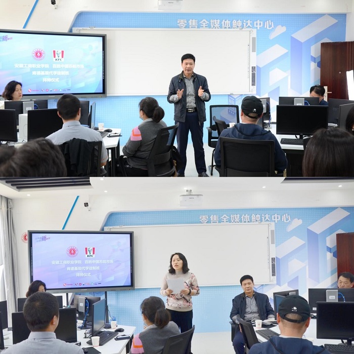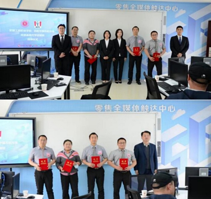 3月26日下午,我校与百胜中国(苏皖区)在管理学院零售全媒体触达实训中心隆重举行了连锁经营管理专业肯德基现代学徒制班拜师仪式。