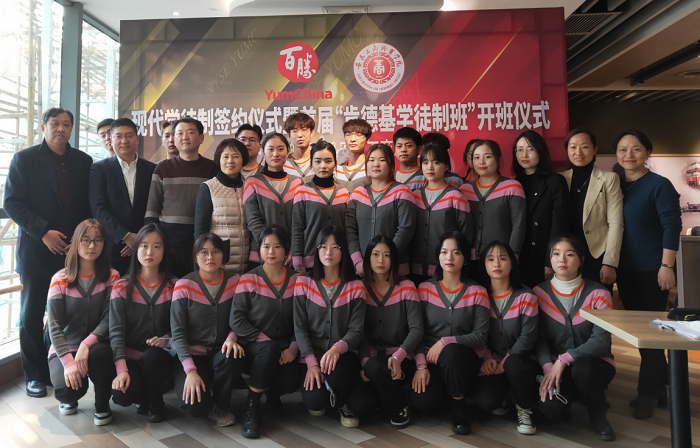 2021年1月4日下午,我校与百胜中国(苏皖区)在肯德基滨湖世纪金源购物中心店隆重举行了连锁经营管理专业现代学徒制校企合作签约仪式暨首届肯德基现代学徒制班开班仪式。安徽工商职业学院党委副书记、校长李雪,管理学院副院长(主持工作)朱小龙、经贸教研室主任方芳、连锁专业骨干教师张显萍、南京肯德基有限公司副总经理陈安成、区域经理姜漪,人力资源部招募经理戴国智、师傅代表世纪金源肯德基餐厅经理李进,及我校2019级肯德基学徒制班级的同学参加仪式。
