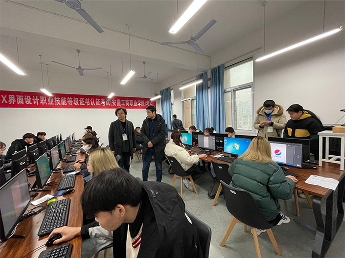 12月29日上午安徽工商职业学院“1+X”界面设计职业技能等级认证考试在庐阳校区艺术设计学院致知楼机房举办。认证考试在学校领导、教务处及有关部门的大力支持和指导下,按照培训评价组织腾讯云计算(北京)有限责任公司组织的全国统一考试。