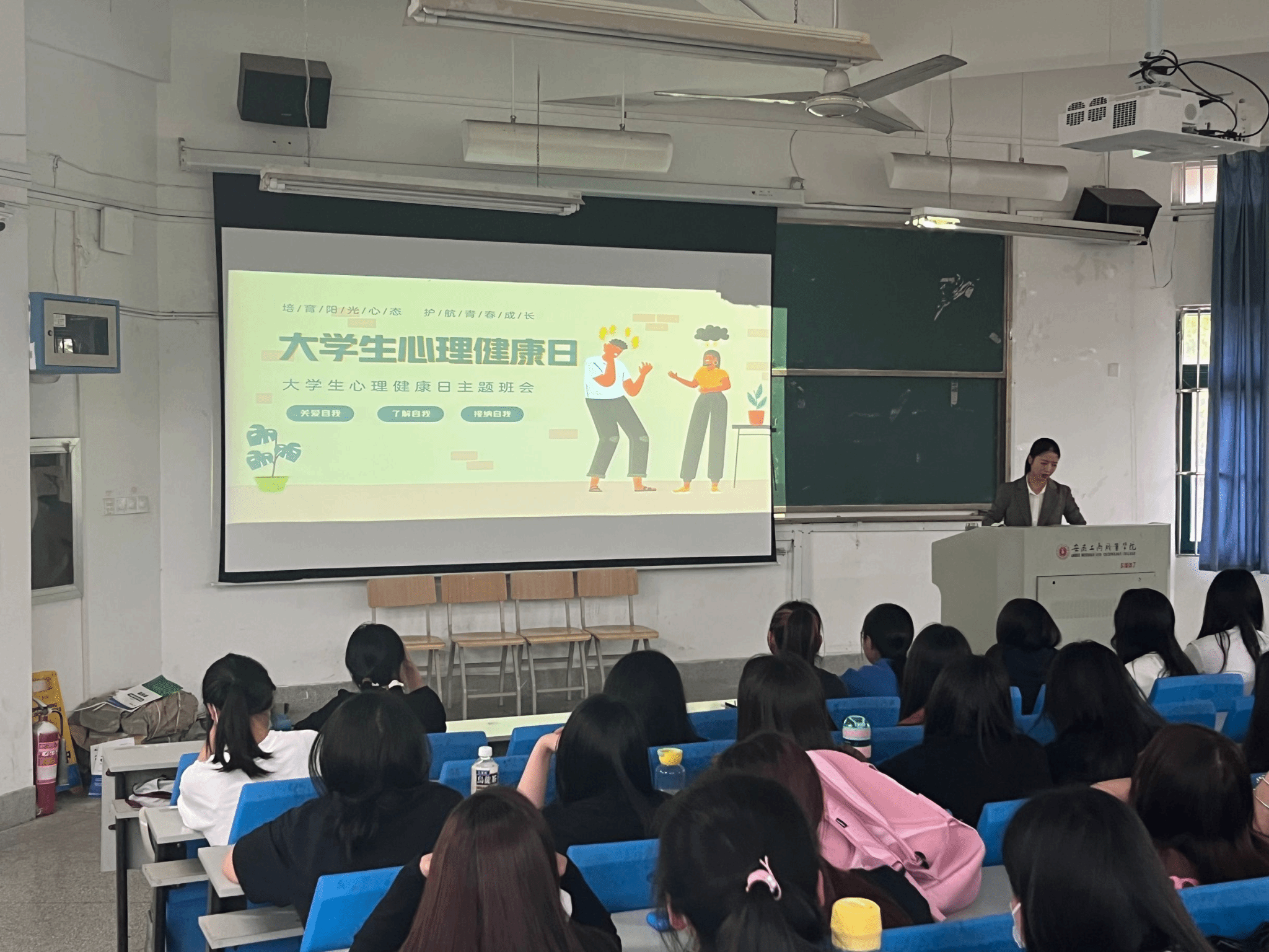 首先,杨玉娇向大家讲解了“5·25”心理健康月的具体含义和核心内容,详细阐释心理健康对大学生成长的重要性。介绍了本次心理健康月活动的主要内容,并提出三点要求,一是同学们要自觉积极主动参加学校、学院举办的各项活动;二是心理委员要发挥积极引导作用,组织好各项活动;三是树立健康第一的理念,完善积极心理品质。学院高度关注学生自身的成长命题,关心学生的健康成长,希望同学们共同传播好自尊自信、乐观向上的现代文明理念和心理健康意识,为学校营造健康、和谐的氛围贡献自己的力量。