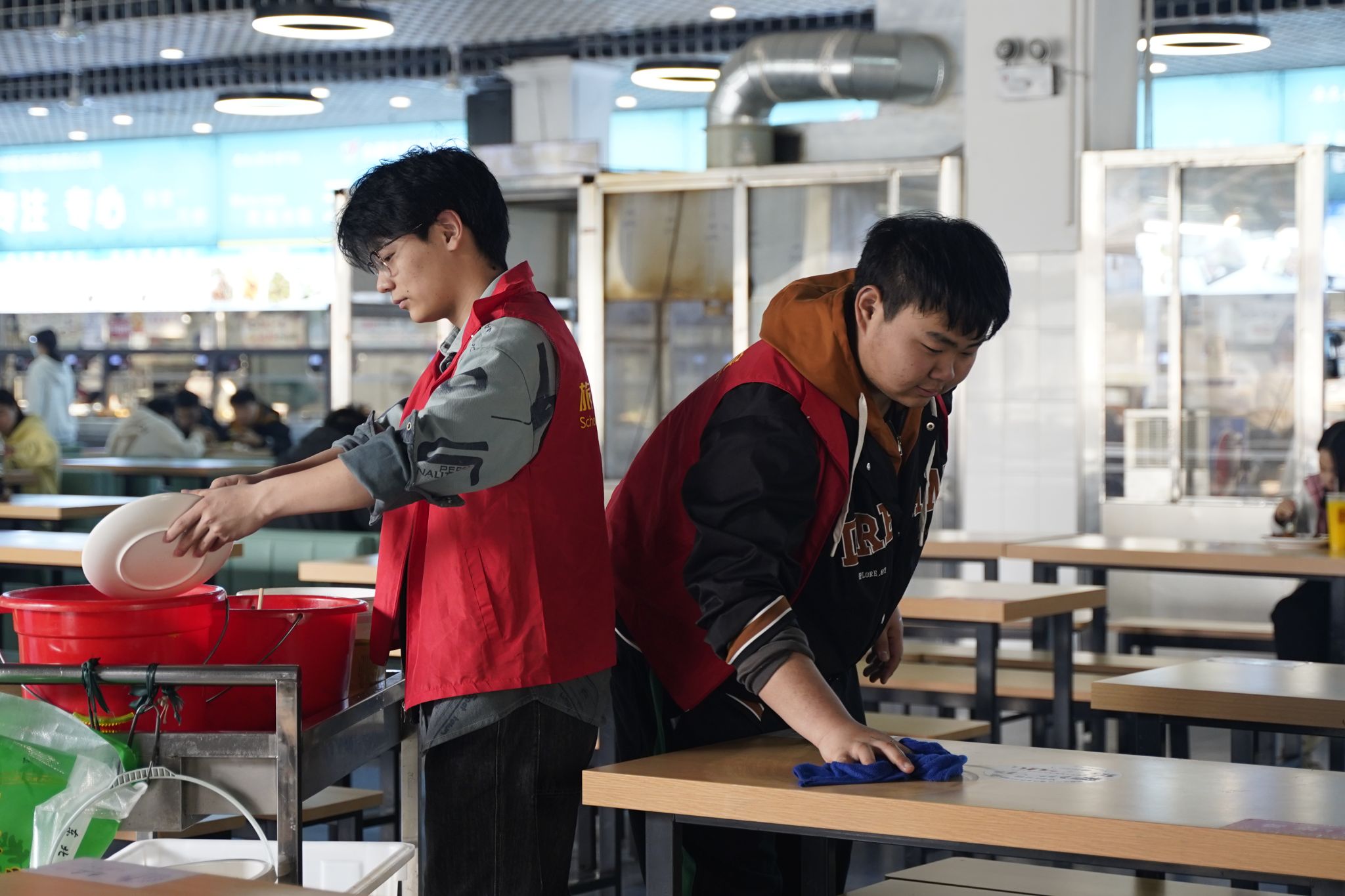 活动期间,志愿者将餐桌上的饭粒、残渣清理到垃圾桶,为下一位吃饭的同学提供干净的桌椅,并帮助食堂阿姨打扫地面上的饭粒、残渣与垃圾,清理卫生死角。与此同时,志愿者们还对同学们就餐过程中出现浪费食物、就餐后餐具随意摆放等不文明行为进行劝导,维护餐厅就餐秩序,营造良好的就餐环境。