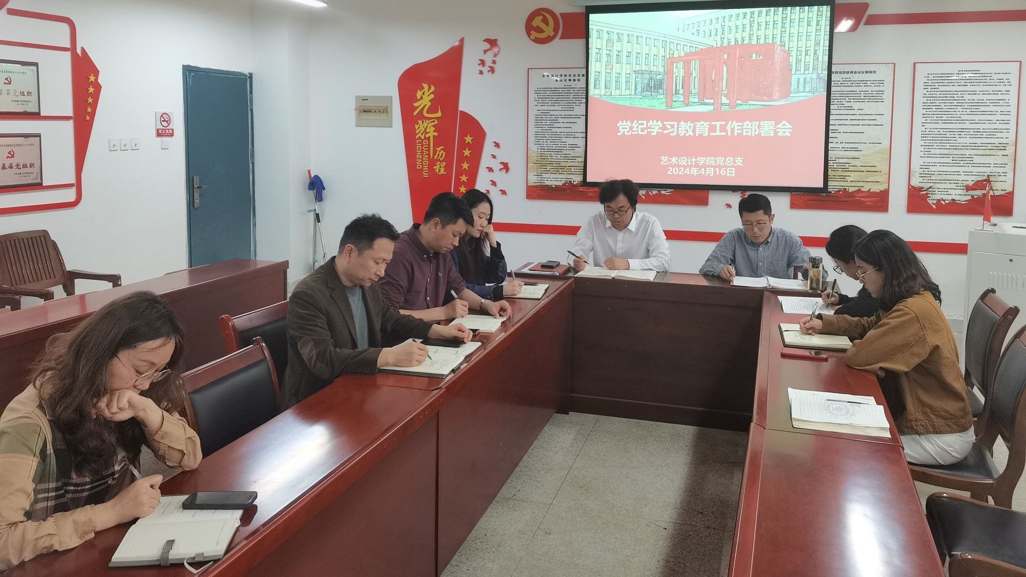 4月16日下午,艺术设计学院召开党总支委员会扩大会议,动员部署党纪学习教育工作。党委委员、党委宣传统战部部长、艺术设计学院党总支书记孔成,艺术设计学院党总支副书记张乐,学院党总支委员,相关行政人员参加会议。