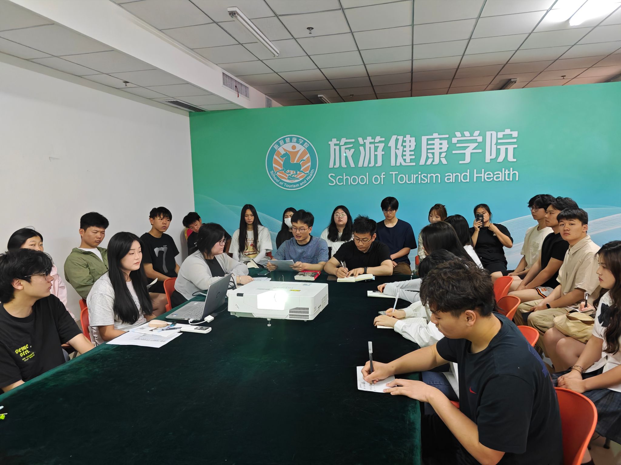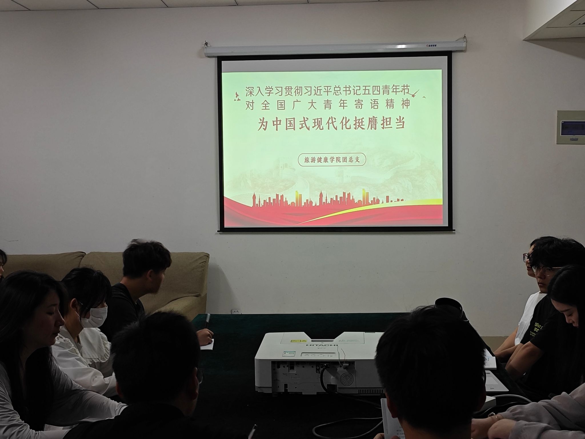 今年的五四青年节前夕,中共中央总书记、国家主席、中央军委主席习近平代表党中央,向全国广大青年致以节日祝贺和诚挚问候。深情寄语广大青年要继承和发扬五四精神,奋力书写为中国式现代化挺膺担当的青春篇章。为进一步弘扬五四精神,引导广大团员青年赓续红色血脉、勇担时代重任,5月25日,旅游健康学院组织开展专题活动,学习习近平总书记五四青年节对全国广大青年寄语精神。旅游健康学院团总支书记殷宏伟、专职辅导员方针以及各班级团支部书记参加学习活动。
