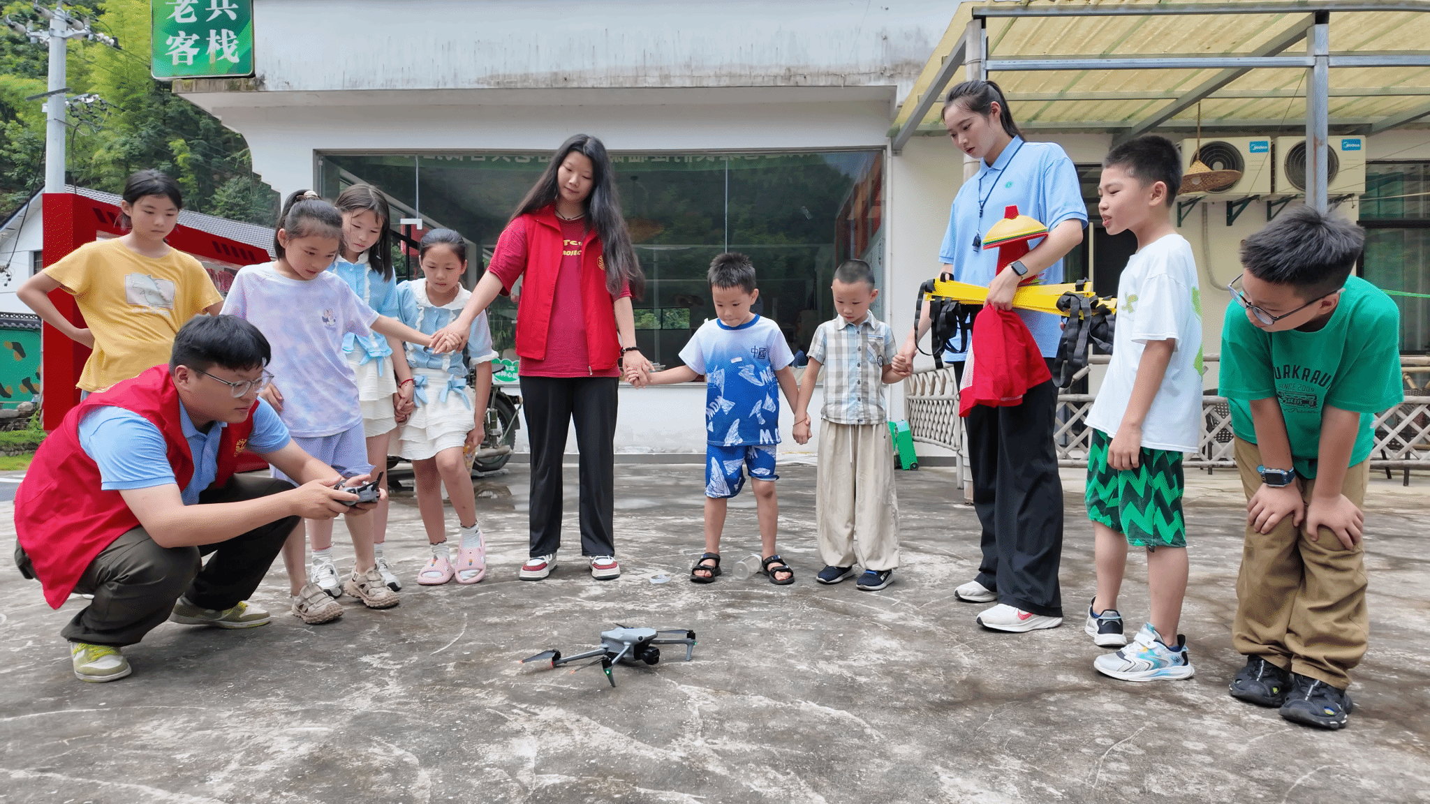 课业辅导环节,志愿者针对语文、数学等学科设计“趣味学习包”,将作业答疑转化为“知识大闯关”,增添学习的趣味性。绘画书法教学中,孩子们用画笔描绘,用毛笔书写,在色彩与线条间感受艺术之美。烹饪工艺与营养专业志愿者王浩婷依据专业学习中的非遗面塑技艺,指导孩子们通过一双双小手揉捏出“小兔子”“大熊猫”等作品,让非遗文化在孩子们指尖悄然传承。健身指导与管理专业志愿者孔可璐将少儿体适能训练带到了课堂上,巧妙设计了“绳梯跳跃”“平衡木挑战”“标志盘敏捷反应力训练”等游戏,帮助孩子们提升身体协调性。最令孩子们雀跃的是无人机演示环节,志愿者操作无人机拍摄村庄全景,讲解无人机和航拍知识,当看到自己设计的渔临村航拍路线图在屏幕上呈现时,孩子们眼中闪烁着对科技的向往。
