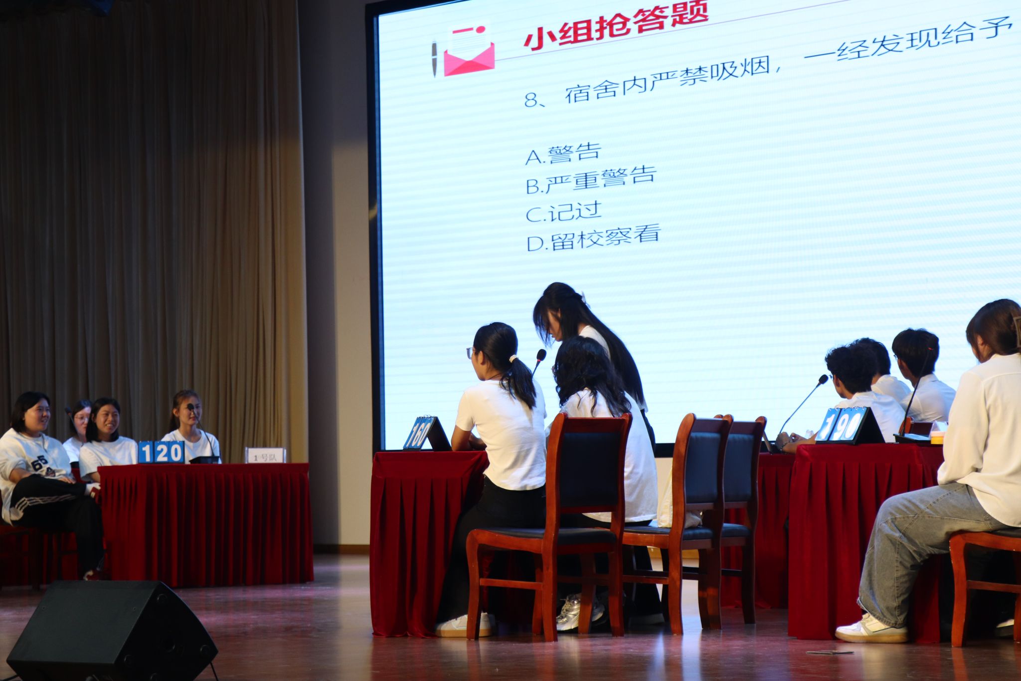 在团体现场竞赛阶段,根据笔试成绩和学习效果综合表现,共有8个团体入围现场赛。现场赛分为必答题、简答题和风险题三个环节,旨在考查同学们的学习成果、反应速度和团队合作能力。选手们思维敏捷,沉着冷静,既保持了较好的竞赛状态,更体现了对手册内容的扎实学习。