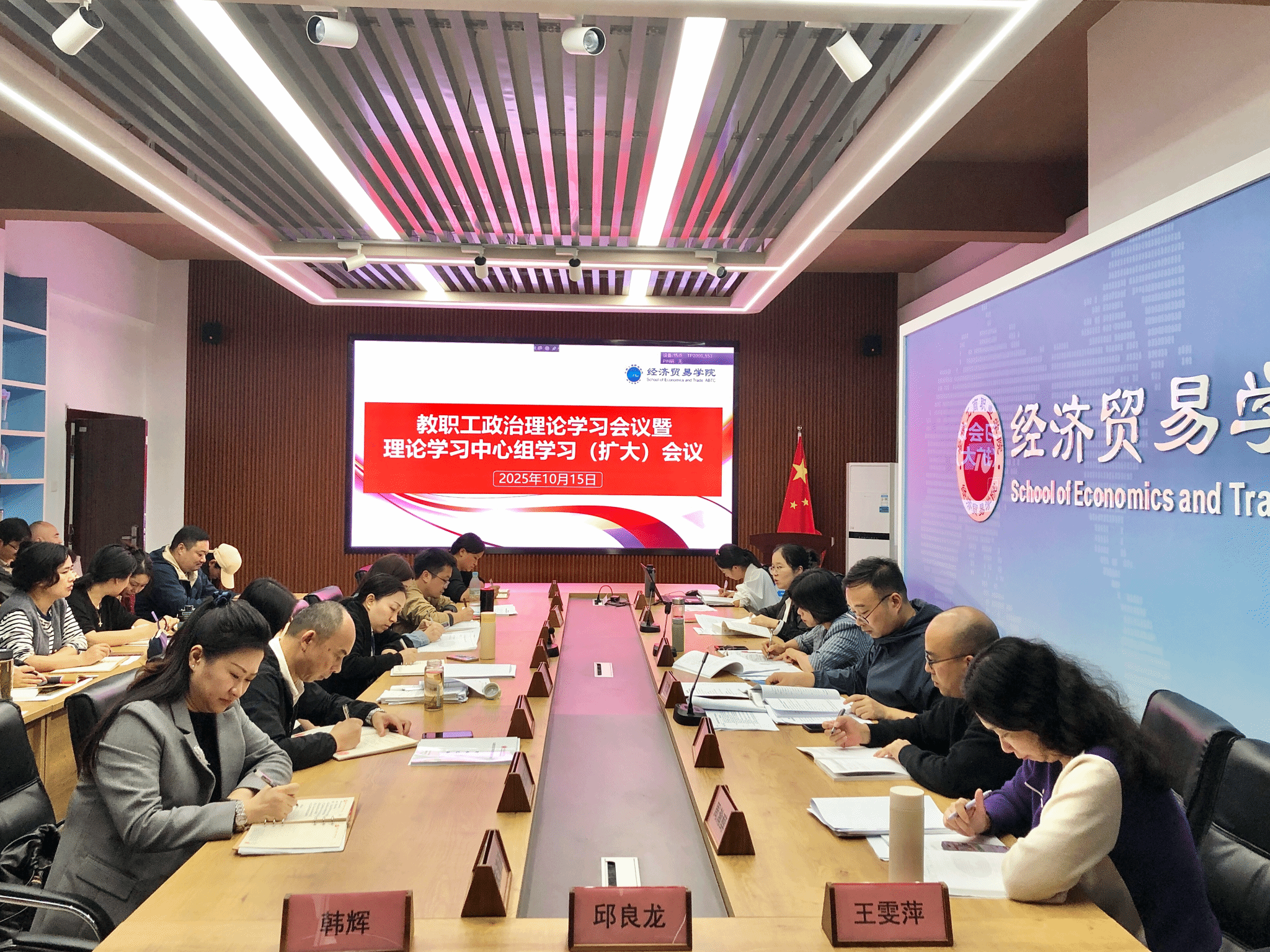 10月15日,经济贸易学院党总支在5楼教师能力提升中心召开教职工政治理论学习暨理论学习中心组学习(扩大)会议,会议传达学习习近平总书记在中共中央政治局第二十二次集体学习时的重要讲话精神、习近平总书记给全国特岗教师代表重要回信精神、习近平给天津大学全体师生的回信中的精神,学习《习近平谈治国理政》第五卷部分章节内容。会议由党总支副书记马莉主持,全体教职工参加会议。