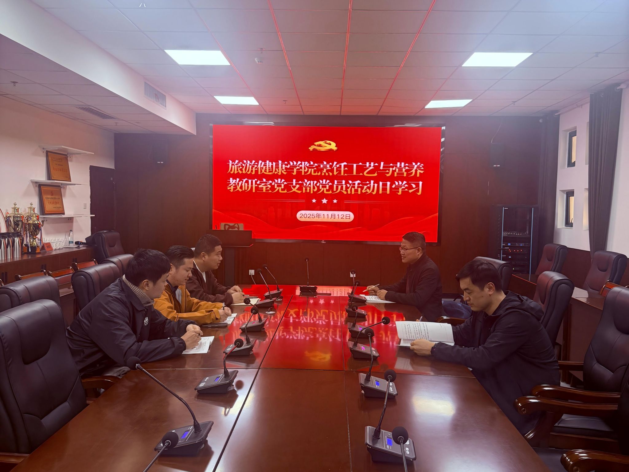 2025年11月12日下午,安徽工商职业学院烹饪工艺与营养教研室党支部在旅游健康学院三楼会议室召开十一月主题党日活动。本次会议由党支部书记左旦主持,支部全体党员参加。
