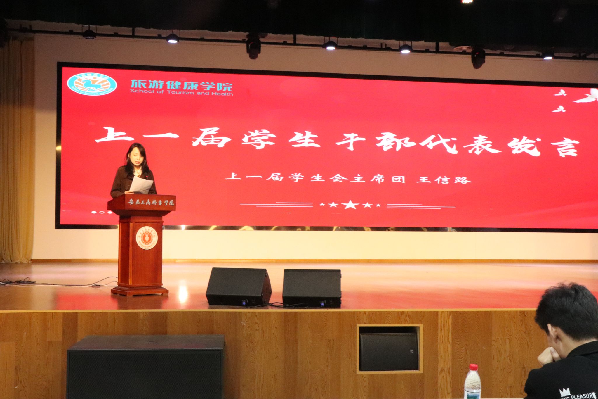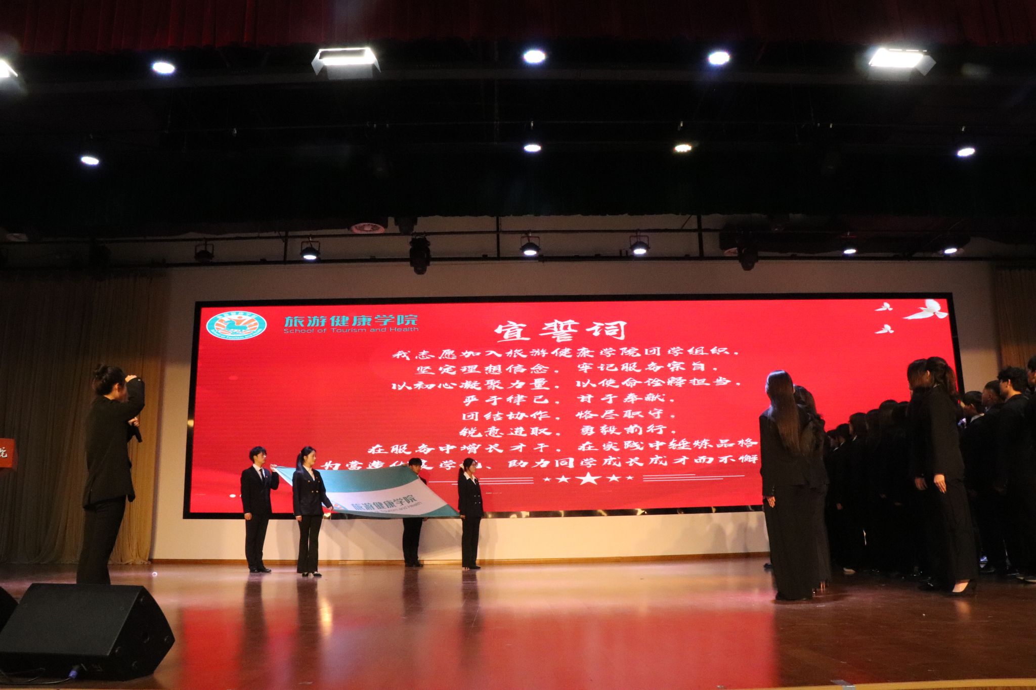 11月12日中午,旅游健康学院在大学生活动中心隆重召开2025年度团学组织换届表彰大会,总结过去一年团学工作成果,表彰先进集体与个人,并完成新一届团学组织骨干的聘任仪式。旅游健康学院党总支书记杨锐、组织员张程程、办公室主任孙群以及团学组织指导老师和辅导员代表出席大会。