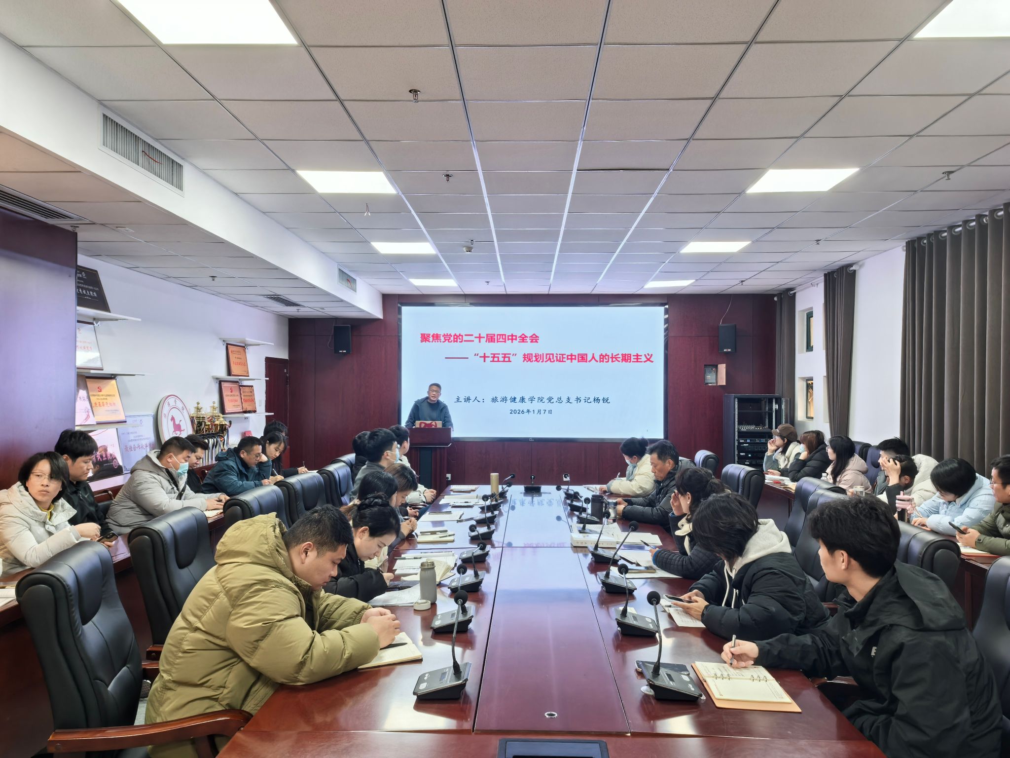 最后,杨锐以《聚焦党的二十届四中全会——“十五五”规划见证中国人的长期主义》为题,为全体教职工上了一堂生动的微党课。党课围绕“十五五”时期经济社会发展的指导思想、“六个坚持”重大原则、高质量发展取得显著成效等主要目标、战略任务和根本保证进行了层层剖析。结合安徽“十五五”时期坚持科技打头阵,一体推进教育科技人才发展和大力发展文旅康养产业,打造长三角康养旅游目的地的战略部署,杨锐重点解读了高校在建设教育强省、科技强省、人才强省中的使命担当,学院要抓住区域文旅融合、康养产业升级的发展机遇,立足旅游管理、健康服务与管理等专业特色,找准学院服务地方产业发展的切入点与发力点,推进特色专业建设和产教融合,为安徽高质量发展培育高素质人才。